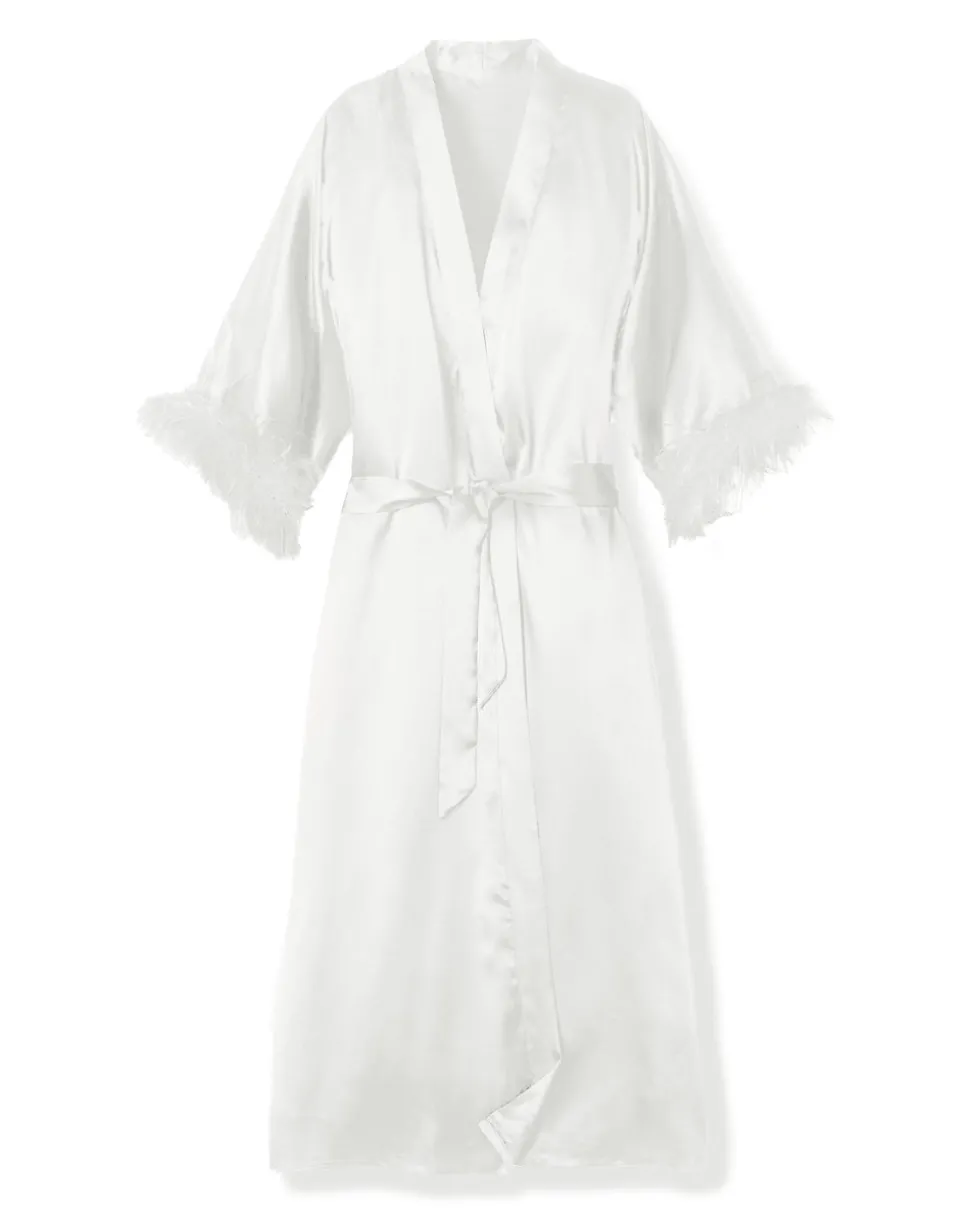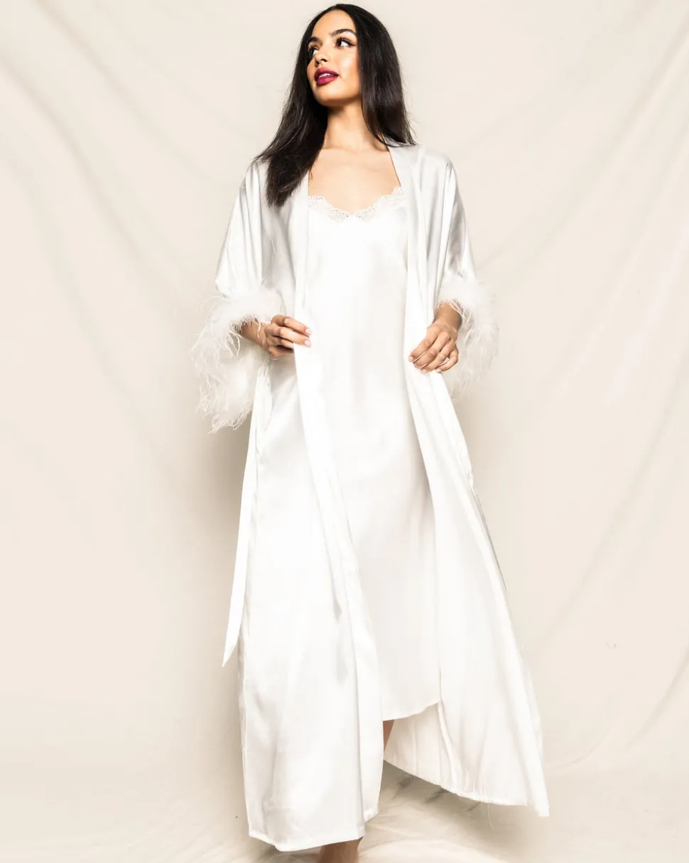 Petite Plume’s luxury sleepwear is a dream come true. Crafted in exquisite cotton, with the finest attention to detail, no chemicals, and classic silhouettes, Petite Plume delivers the utmost comfort and sophistication to every man, woman and child who wears it. Made in unbelievably soft silk, and featuring an elegant waist tie and willowy feather trim on the generous cuff, the 100% Mulberry White Silk Luxe Long Robe with Feathers is the height of luxe lounge wear. With its ankle length, it offers Old Hollywood glamour and a sensuous choice for early mornings, bedtime, or really anytime.
