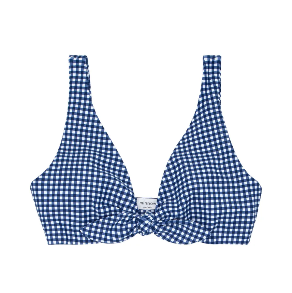 A family favorite for its clean lines and simple details, minnow creates pieces that are playful, polished, and thoughtfully designed for long days, sandy toes, and the wonderment of life on the shore. A timeless bikini silhouette is designed to flatter, now in classic navy gingham and featuring molded cups and an adjustable back tie. So chic and fun. Pair it with matching bottoms.