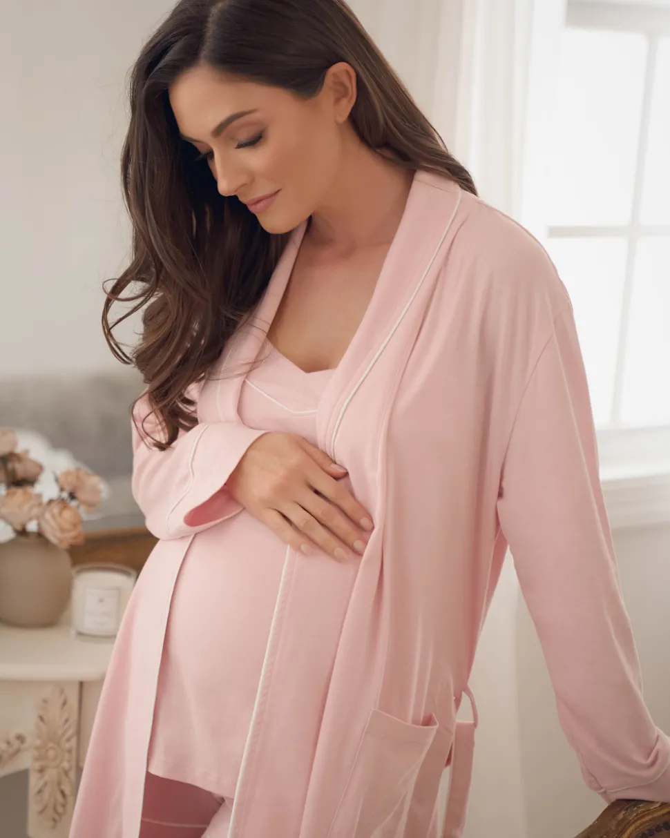 Petite Plume wishes you a “bonne nuit,” and in their luxury sleepwear, it’s hard not to oblige. Crafted from the softest 100% Pima Cotton with a gentle stretch, the Women’s Pima Maternity Robe in Pink is an essential maternity accessory. Roomy, comfortable and buttery soft, with a length that falls below the knee for ease of movement, these robes include all the classic details (chic piping on the cuffs, generous sash) that grace the brand’s beloved classic pajama silhouettes.