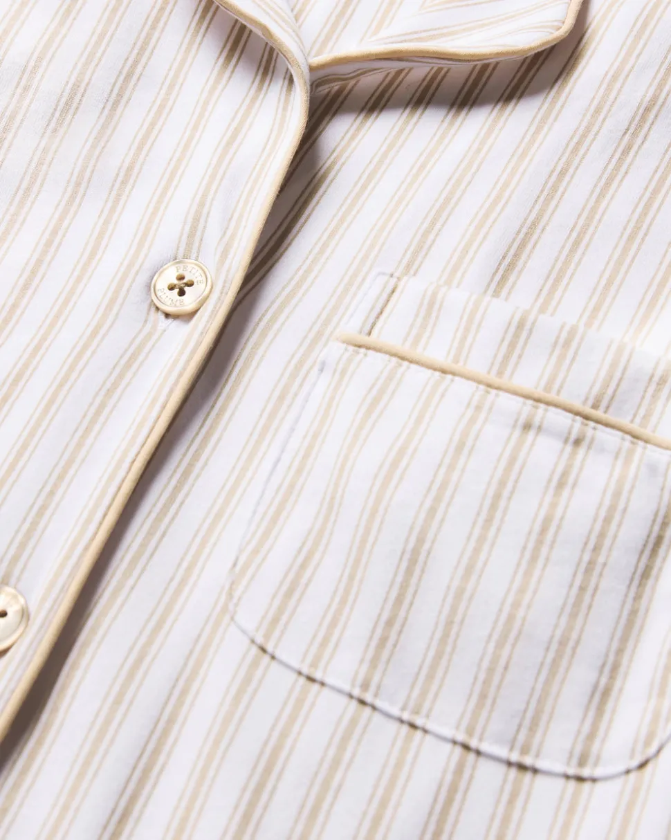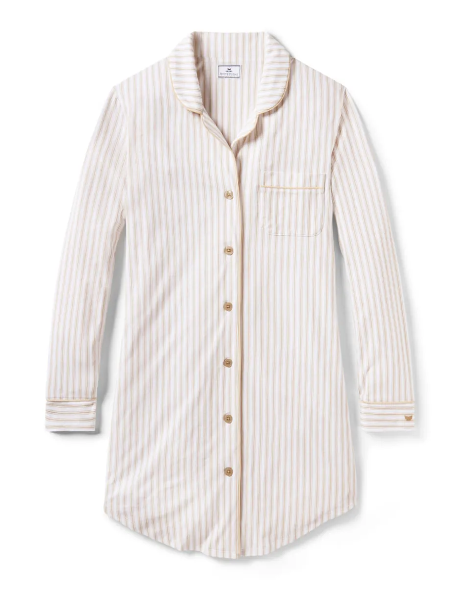 Petite Plume wishes you a “bonne nuit,” and in their luxury sleepwear, it’s hard not to oblige. Traditional French ticking finds new life in an elegant colorway with crisp lines and vintage-inspired charm. Sewn in Petite Plume’s signature Pima Collection, the Women’s Pima Nightshirt in Camel Ticking are crafted from a luxurious, supple jersey knit that drapes beautifully and softens further with each wash. Buttery smooth yet breathable, this timeless style is yarn-dyed to prevent fading and destined to become a fixture of your soothing bedtime ritual.