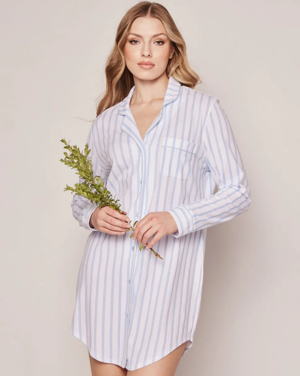 Our Nightshirt carries the spirit of Audrey Hepburn when she borrowed her leading man’s dress shirt for an impromptu overnighter. Rendered in the softest most luscious Pima, yet tailored just like a classic PJ top. Sexy mid-thigh length with shirt-tail hem.