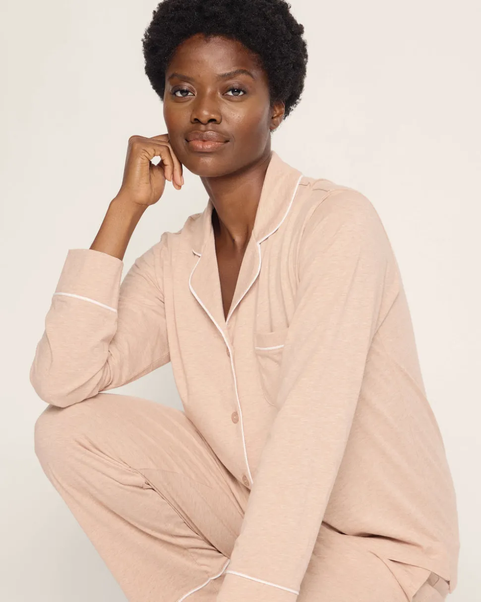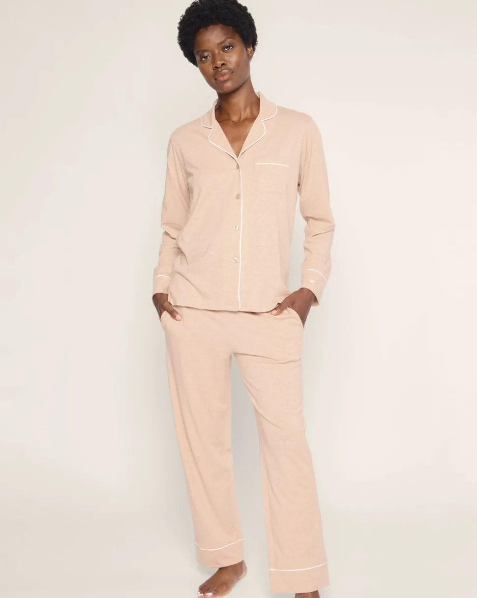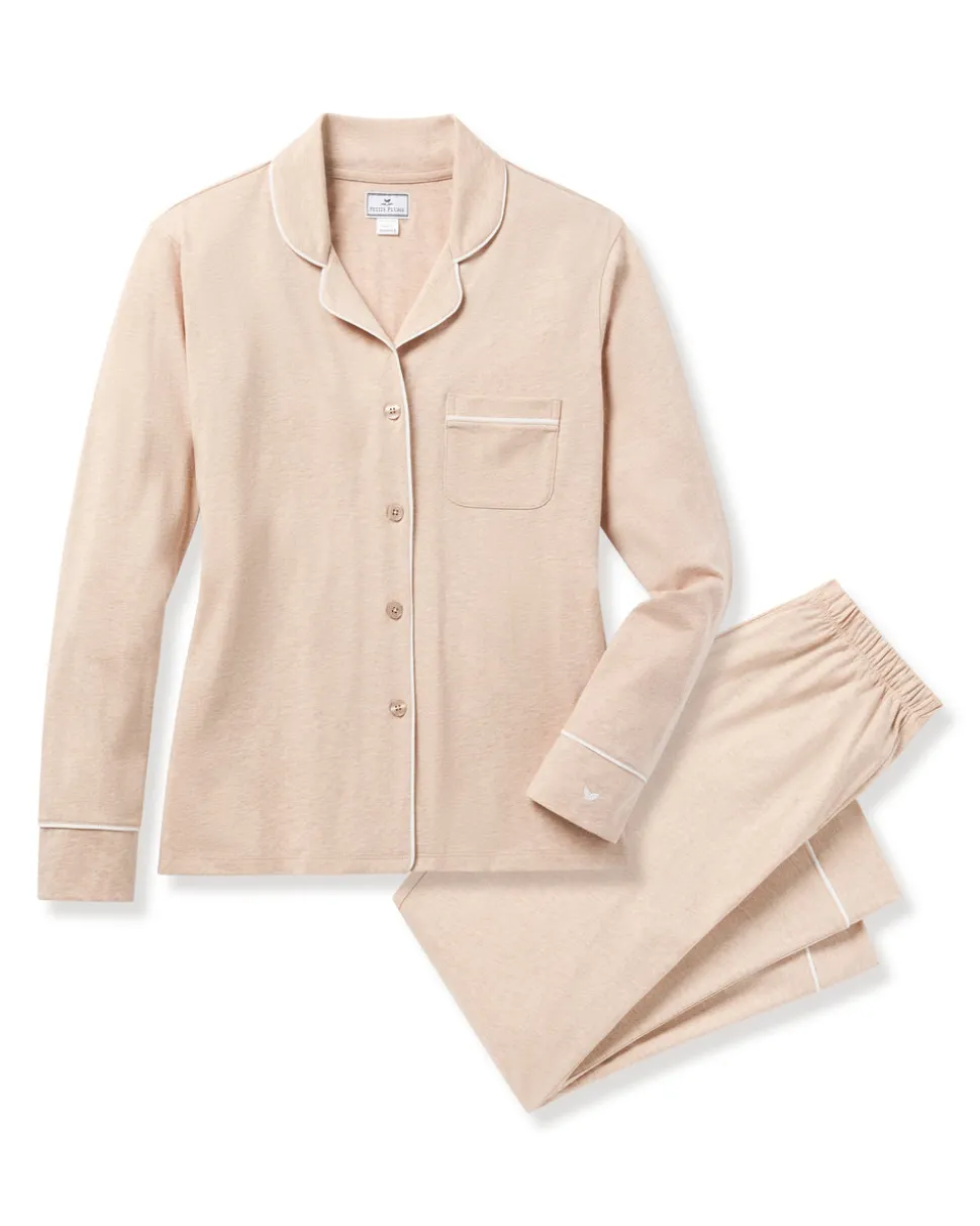 Petite Plume wishes you a “bonne nuit,” and in their luxury sleepwear, it’s hard not to oblige. The Women’s Pima Pajama Set in Camel features a classic pattern that is here to stay, with no frills just clean, crisp lines. The quintessential, timeless pajama silhouette that always feels fresh: supple elastic waist, single piping detail at collar, breast pocket, and pajama pant cuff and practical pockets.