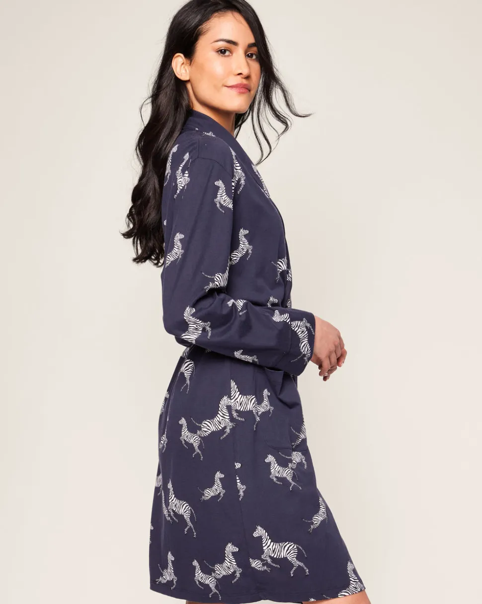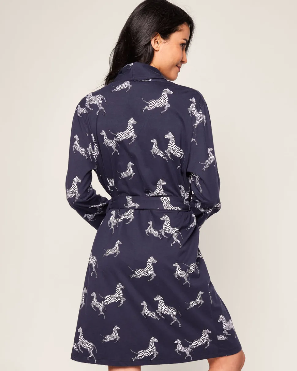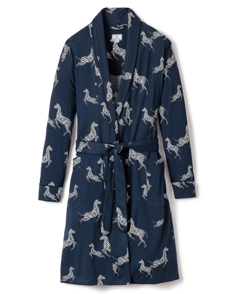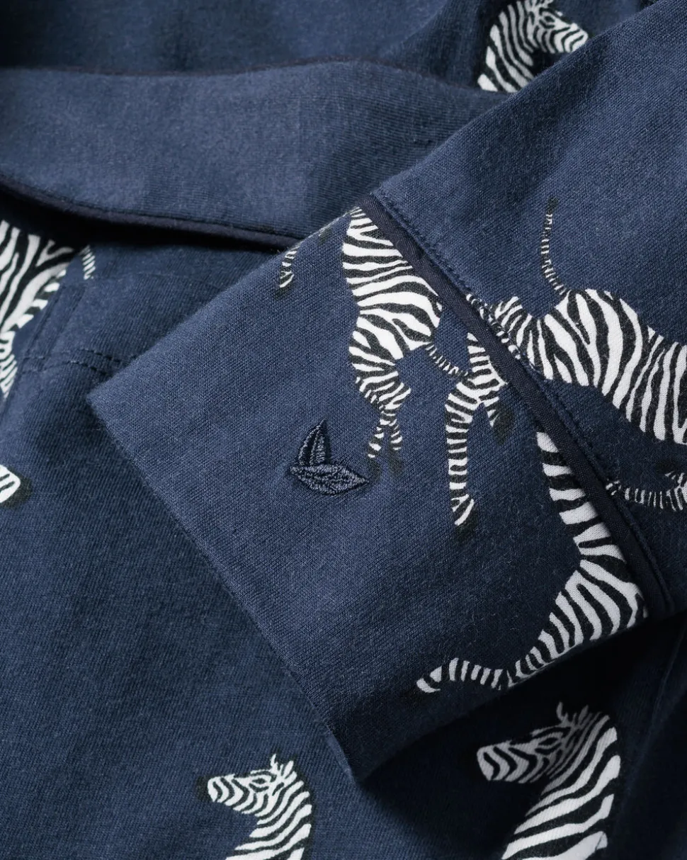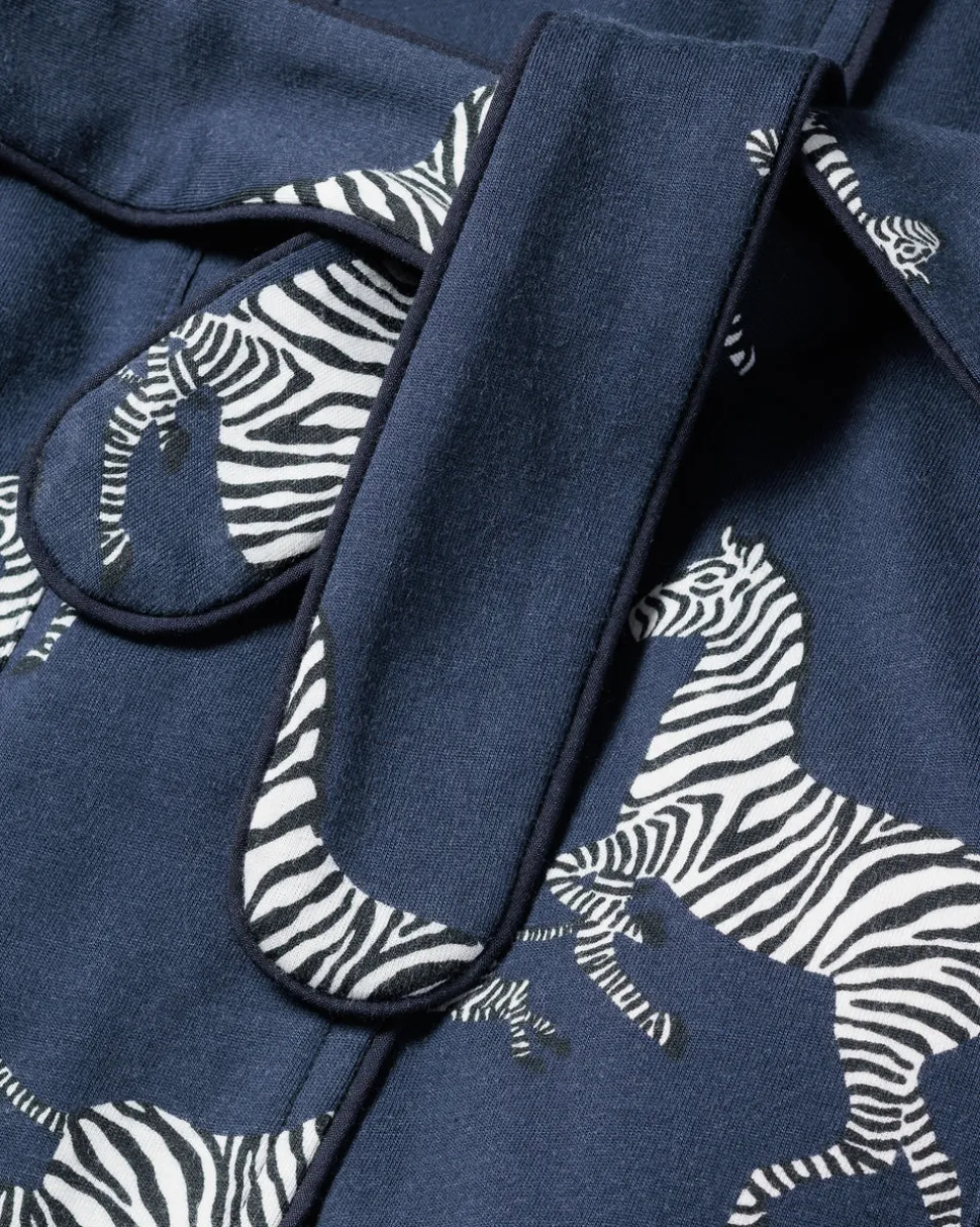 Petite Plume wishes you a “bonne nuit,” and in their luxury sleepwear, it’s hard not to oblige. Crafted in exquisite cotton, with the finest attention to detail, Petite Plume delivers the utmost comfort and sophistication. The Women’s Pima Robe in Zèbre de Nuit is sewn from this exquisite fabric: luxurious, supple jersey knit pajamas that drape beautifully and continue to soften with each washing. These elegant pajamas were made with a fun printed design. This classic pattern is here to stay, with no frills just clean, crisp lines. This classic pajama set is accented with navy piping and finished with pearl buttons.