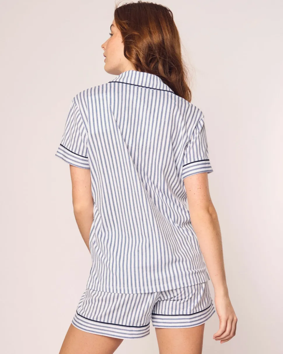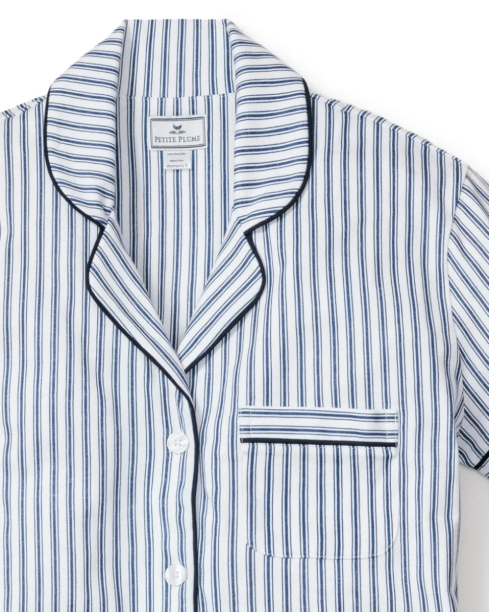 Petite Plume wishes you a “bonne nuit,” and in their luxury sleepwear, it’s hard not to oblige. The Women’s Pima Short Sleeve Short Set in Navy French Ticking features a classic pattern that is here to stay, with no frills just clean, crisp lines. Arriving in a flirty, comfortable mid-thigh length short, the Pima Collection is sewn from this exquisite fabric: luxurious, supple jersey knit pajamas that drape beautifully and continue to soften with each washing. Buttery and smooth yet breathable, too, this collection is yarn-dyed to prevent fading and is destined to become a fixture of your soothing bedtime ritual.
