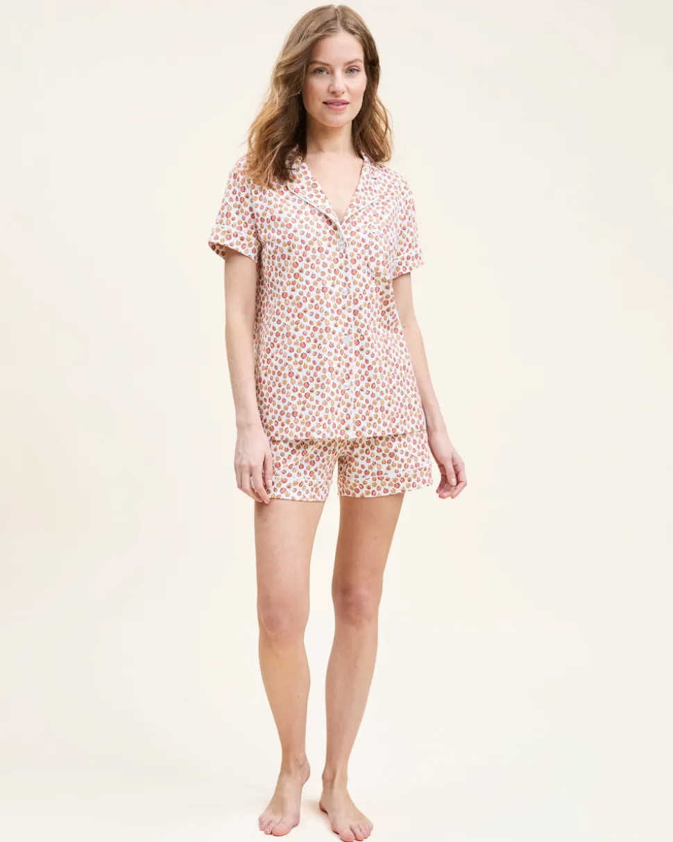 100% Pima cotton. Short sleeve top with button front. Mid-thigh length short with elastic waistband. Tailored piping. Deep pockets. Yarn-dyed for lasting vibrancy.