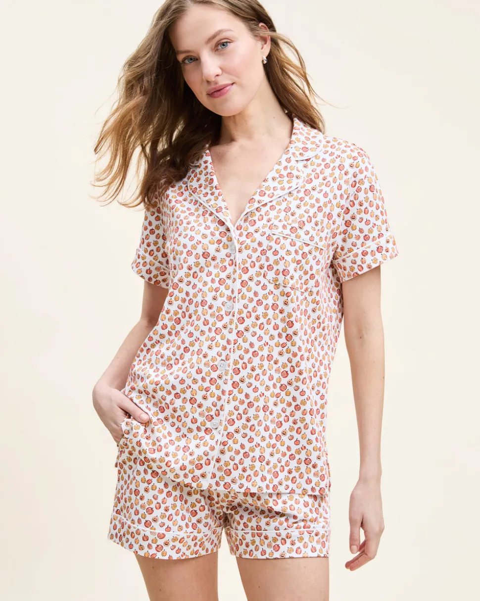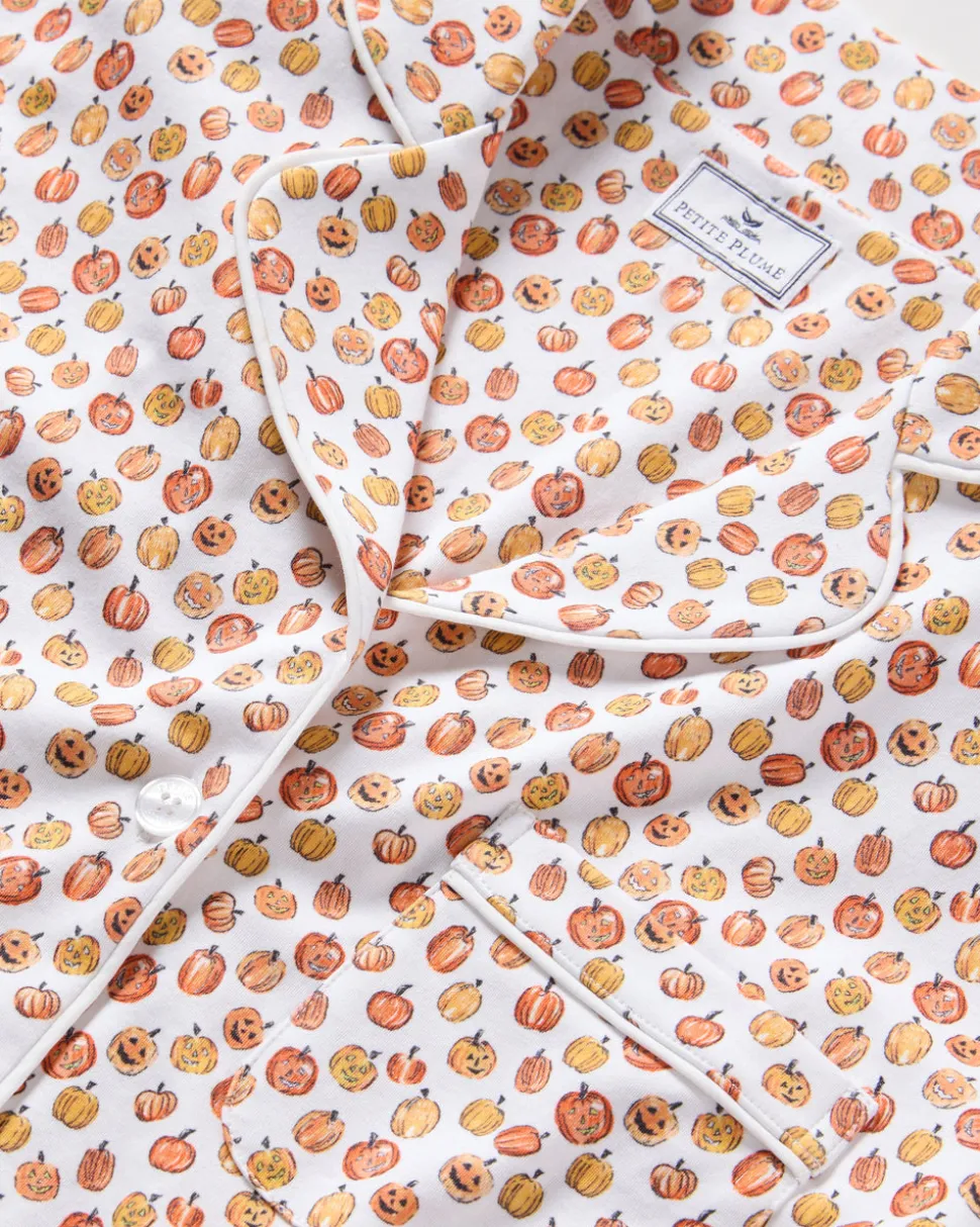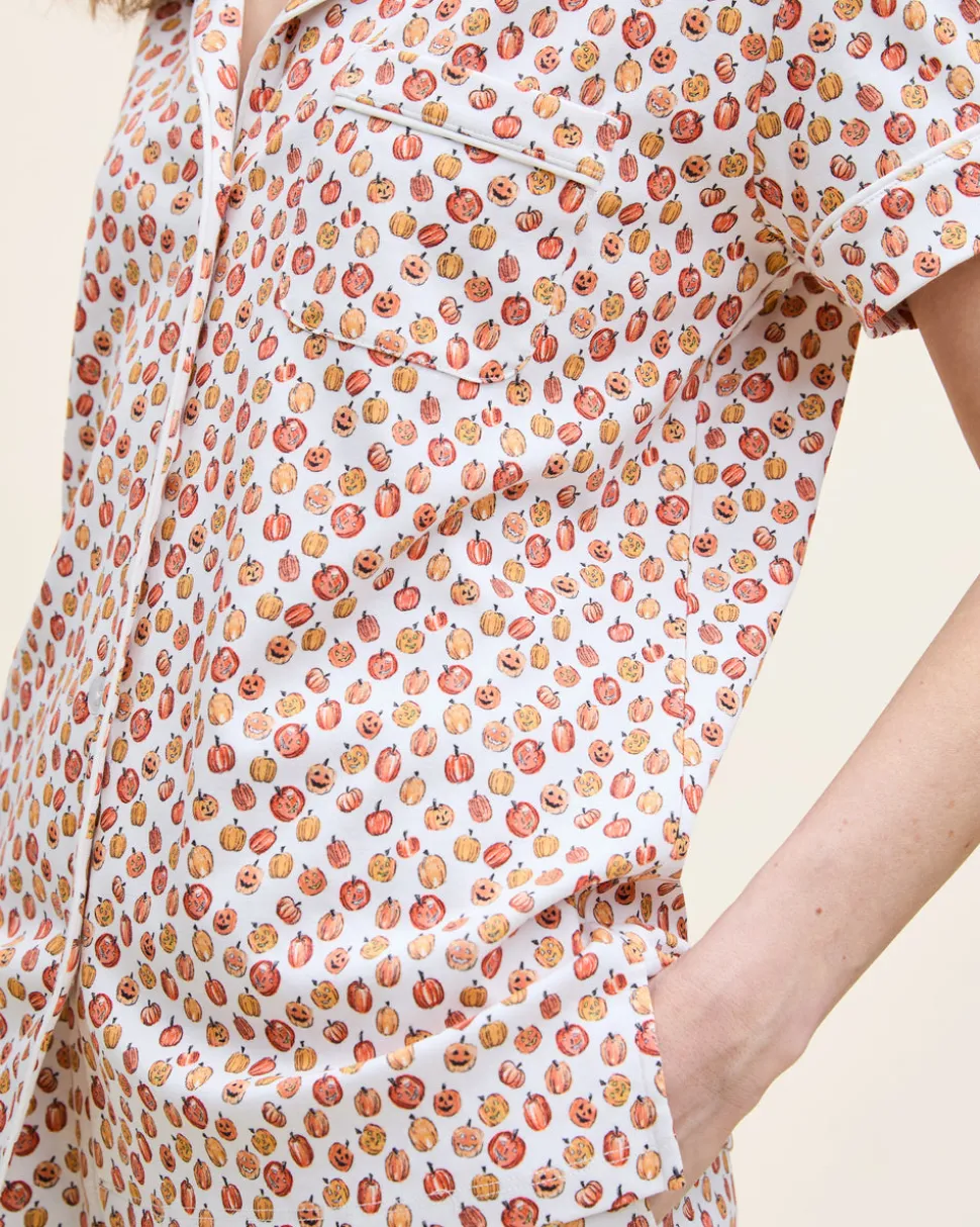 Petite Plume wishes you a “bonne nuit,” and in their luxury sleepwear, it’s hard not to oblige. The Women’s Pima Short Sleeve Short Set in Pumpkin Patch captures the fall feeling with a charming print that’s all treat, no trick. Sprinkled with precious pumpkins and smiling jack-o-lanterns carved just in time for Halloween, this playful design keeps the magic and mystery of the season alive. An abbreviated version of the Classic PJs, this set features tailored piping details and deep pockets, reimagined in a flirty, mid-thigh short silhouette ideal for warmer nights.