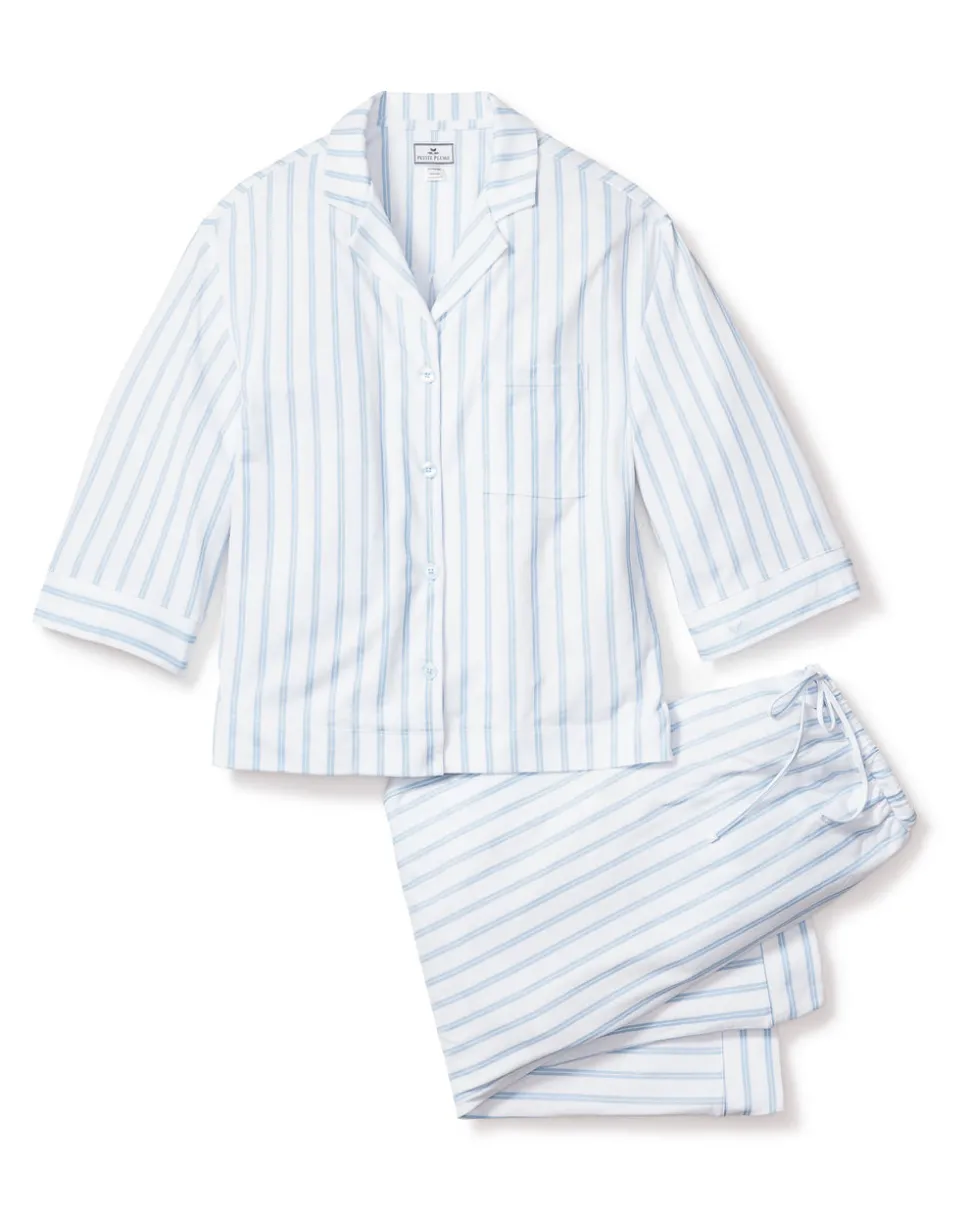 Petite Plume wishes you a “bonne nuit,” and in their luxury sleepwear, it’s hard not to oblige. Crafted from the softest 100% Pima Cotton with a gentle stretch, the Women’s Pima Wide Leg Pajama Set in Periwinkle Stripe is the apex of comfort and feminine tailoring: a well-considered three-quarter length sleeve, for example, and a more generous pant leg that results in that refined swish-swish sensation at your ankle as you walk down a long hallway.