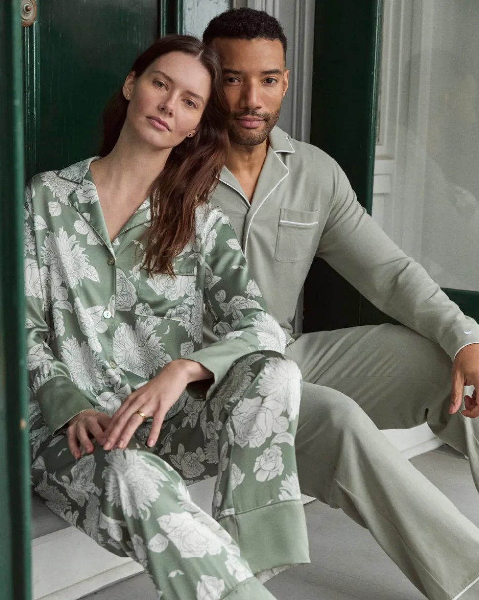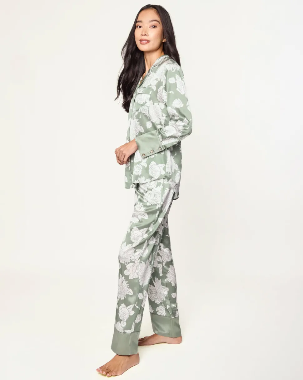 Petite Plume wishes you a “bonne nuit,” and in their luxury sleepwear, it’s hard not to oblige. The Women’s Silk Pajama Set in Sage Bloom blooms with chrysanthemums and roses in a sage and white palette, its vibrant sheen catching the light on crisp autumn mornings. A timeless pajama silhouette designed with refined details, this set is as effortless and comfortable as luxury sleepwear gets.