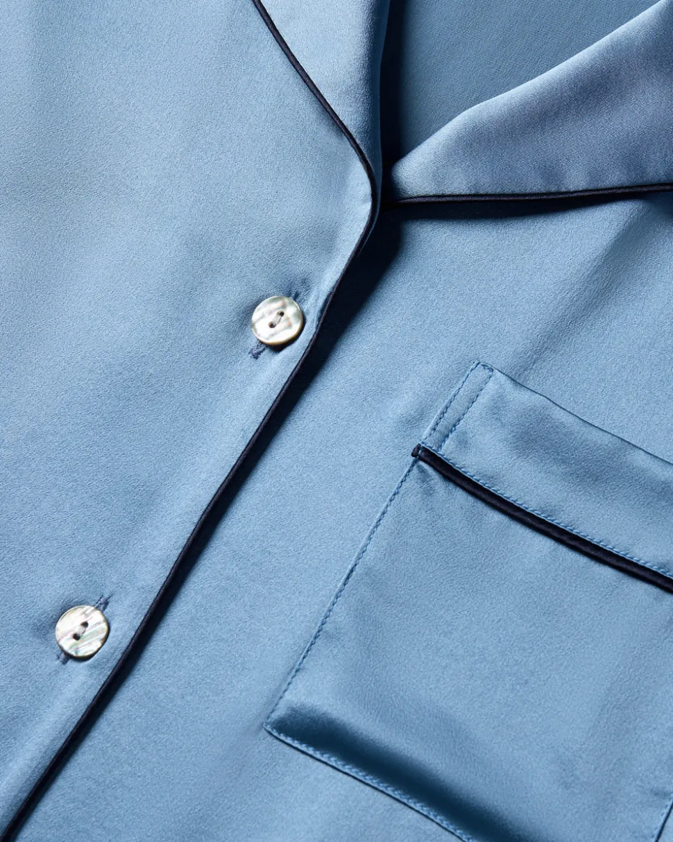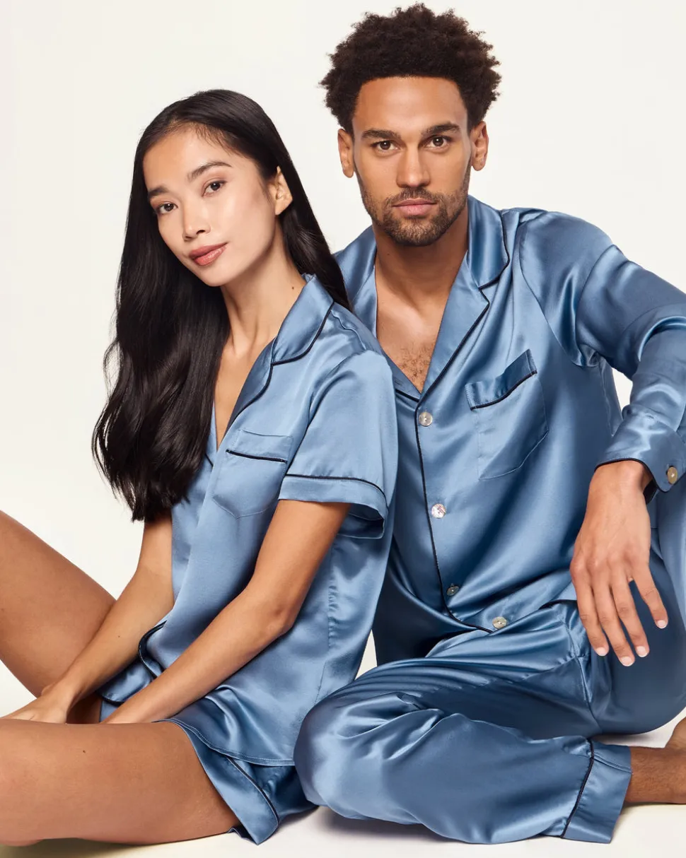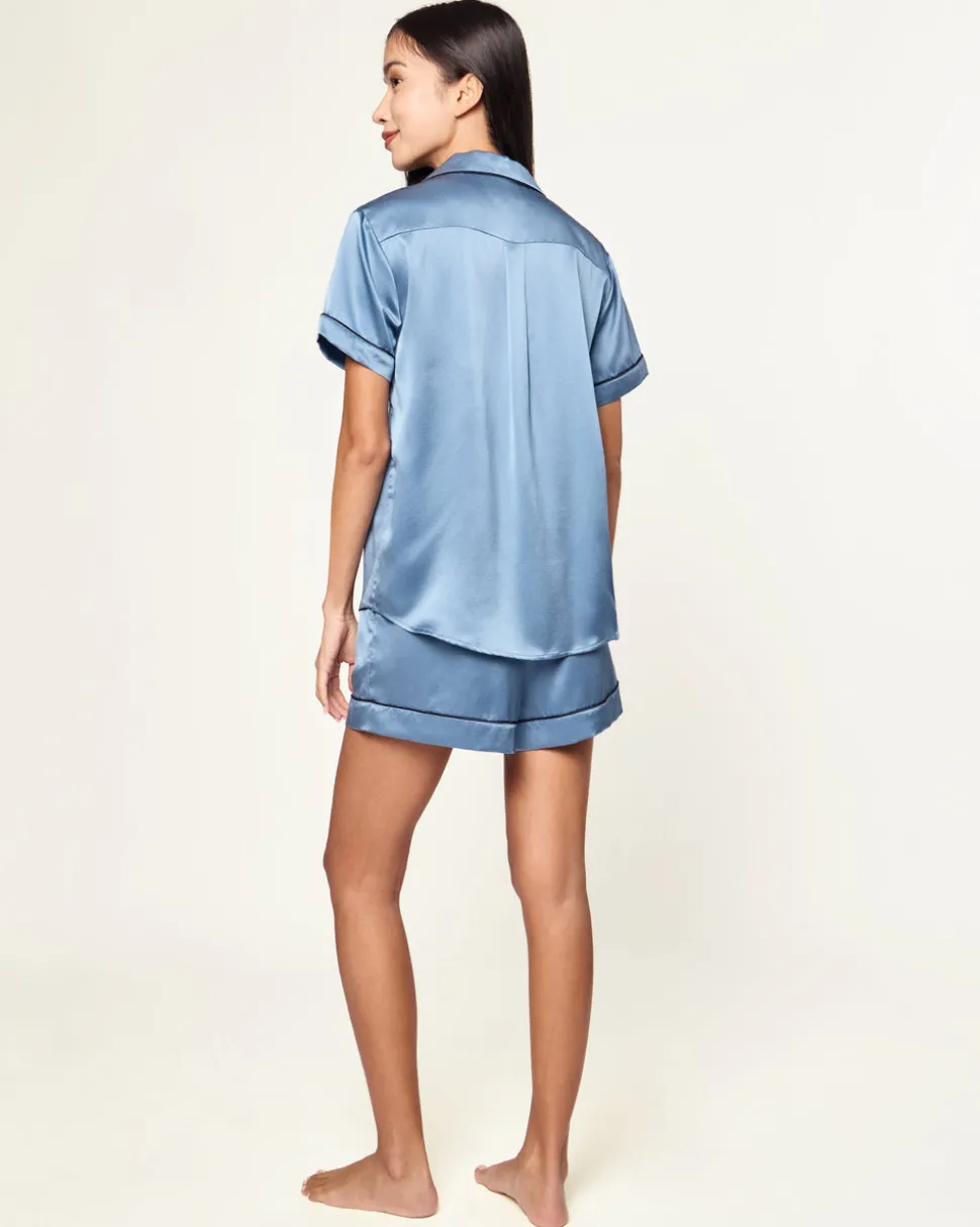 Petite Plume wishes you a “bonne nuit,” and in their luxury sleepwear, it’s hard not to oblige. The Women’s Silk Short Sleeve Short Set in Mystique Blue is rendered in a timeless, elegant blue shade of lustrous mulberry silk—ideal for crisp autumn days, festive holiday evenings, and beyond. A refined take on a classic silhouette, this abbreviated set offers year-round sophistication with the sumptuous touch of pure silk against your skin.