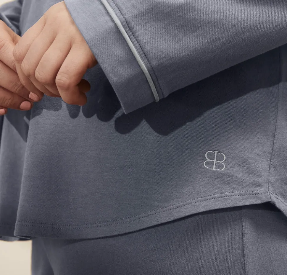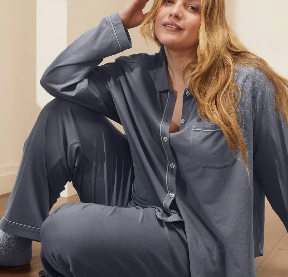Since 2014, Boll & Branch has redefined the textiles industry, setting a higher standard in craft and care. Each thoughtfully made essential brings extraordinary comfort to your home, beginning at the source with the finest natural materials. The Women’s Soft Knit Long Sleeve & Pants Pajama Set in Mineral combines the familiar ease of your favorite lived-in T-shirt with an elevated finish. Crafted from the highest quality 100% organic cotton threads, the knit fabric offers natural softness and a gentle stretch that never clings. Enhanced with the brand’s Luxury Soft-Wash—a process that uses natural enzymes to relax the fibers—this set grows even more sumptuous with every wear.
