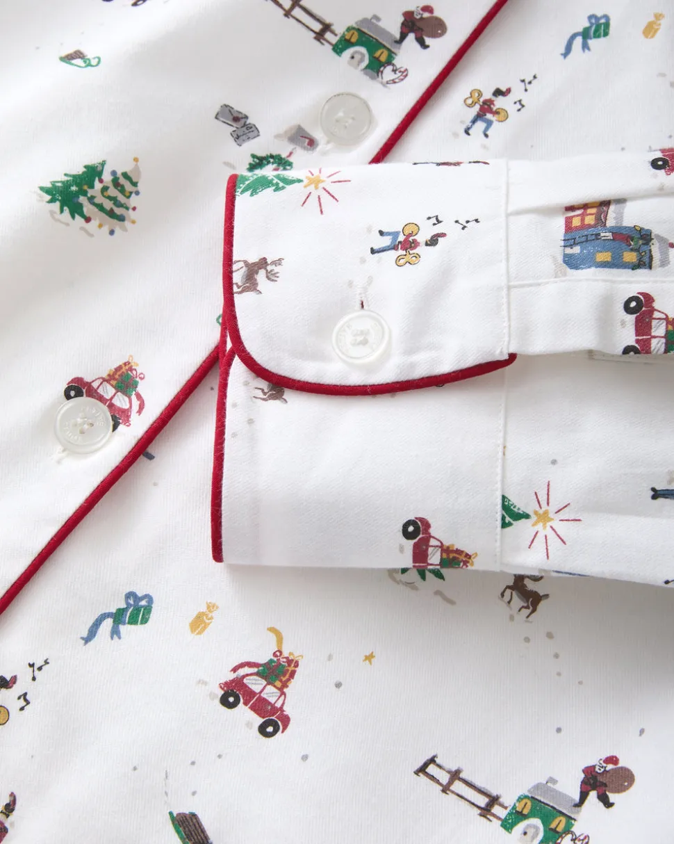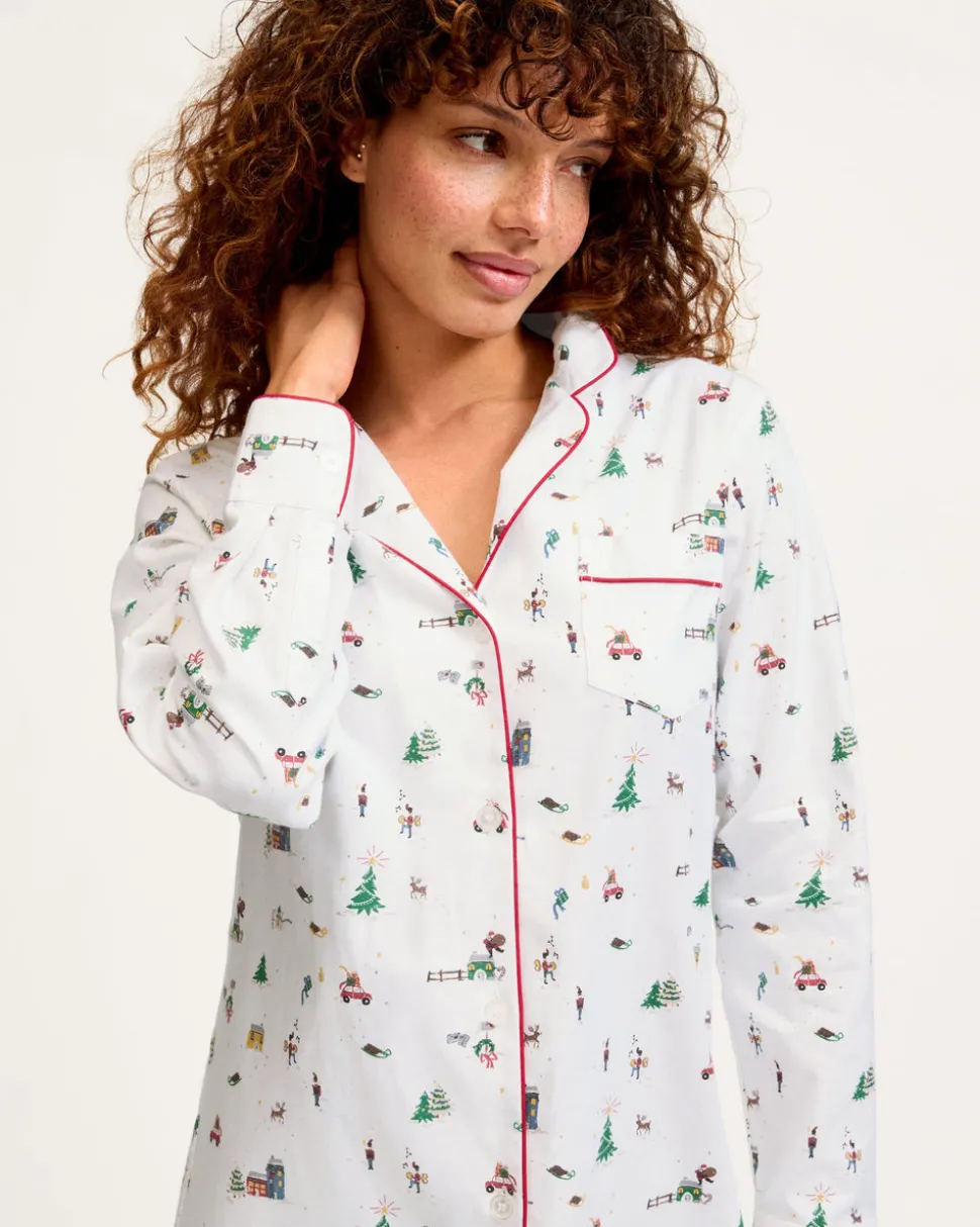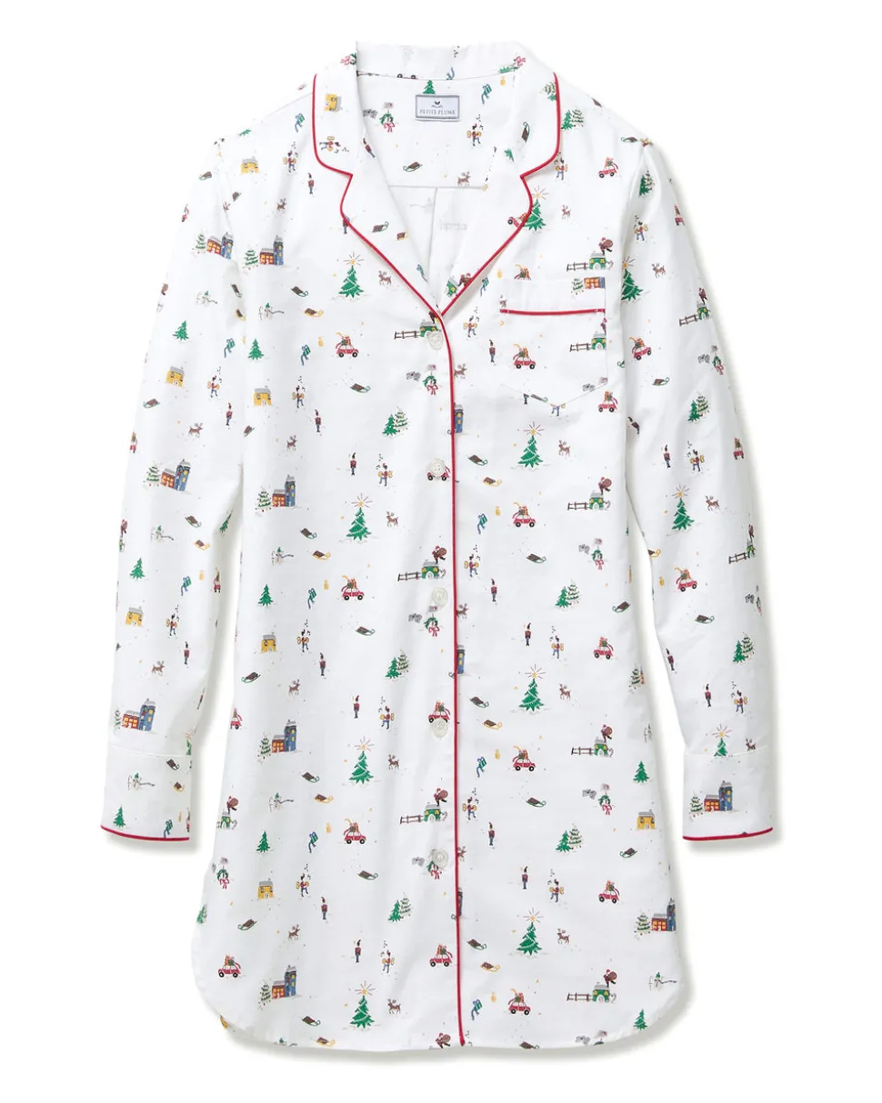 Petite Plume wishes you a “bonne nuit,” and in their luxury sleepwear, it’s hard not to oblige. The joyful sights of this peaceful holiday village will take you down memory lane. Santa winds his way through town, while vintage cars and wooden sleighs glide past pristine wintry decorations. This classic sleep shirt has a roomy fit but looks crisp thanks to details like the classic collar and elegant shirt-tail hem. The fabric is made from 100% of the finest quality cotton. It is yarn-dyed to prevent fade and brushed for added softness making the sleepwear feel absolutely luxurious, getting cozier after each wash.