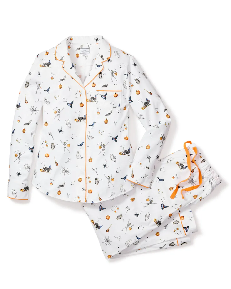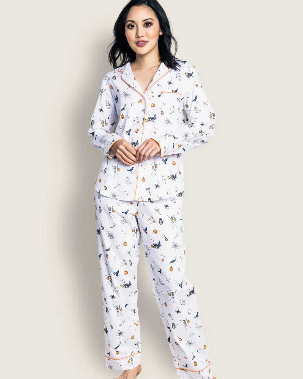 Petite Plume wishes you a “bonne nuit,” and in their luxury sleepwear, it’s hard not to oblige. Crafted in exquisite cotton, with the finest attention to detail, Petite Plume delivers the utmost comfort and sophistication. Mischievous ghosts playfully float around, smiling owls beckon you with their glowing faces, while colorful candy corn adds a touch of sweetness. The Women’s Pajama Set in Trick or Treat print echoes all of the nostalgia and excitement of All Hallow’s Eve, transporting you back to magical nights of childhood. This classic twill pajama set is accented with orange piping and finished with logo buttons.