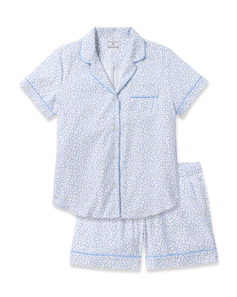 Petite Plume wishes you a “bonne nuit,” and in their luxury sleepwear, it’s hard not to oblige. Crafted from the softest cotton with a gentle stretch, the Women’s Twill Short Sleeve Short Set in Bluehearts boasts relaxed, short sleeves and a mid rise short with side pockets. Buttery and smooth, yet breathable, this collection is yarn-dyed to prevent fading and continues to soften with each washing.