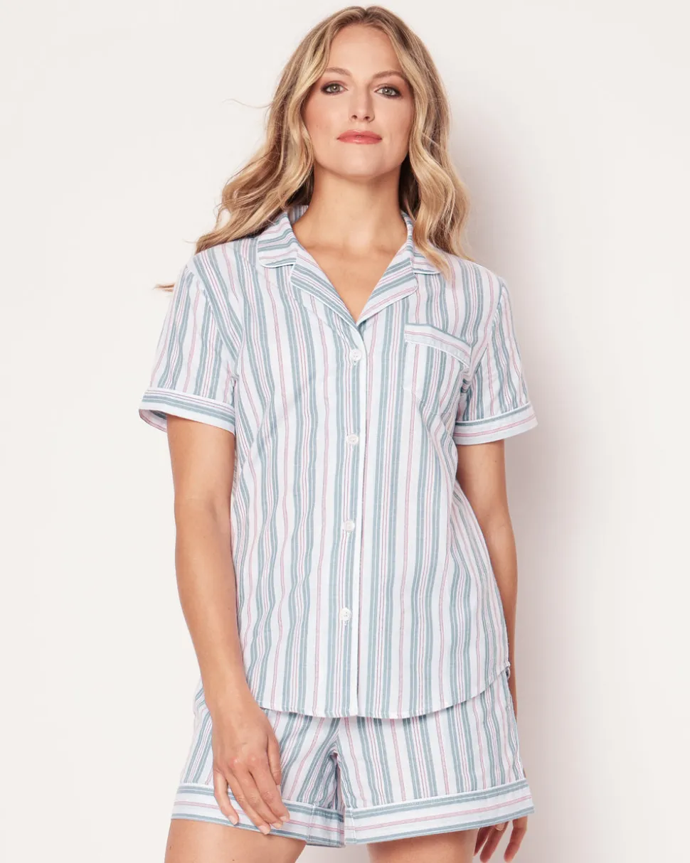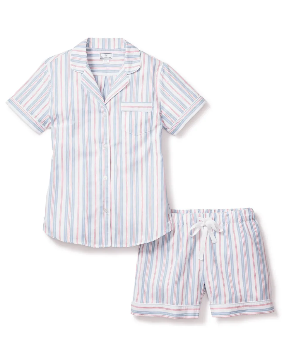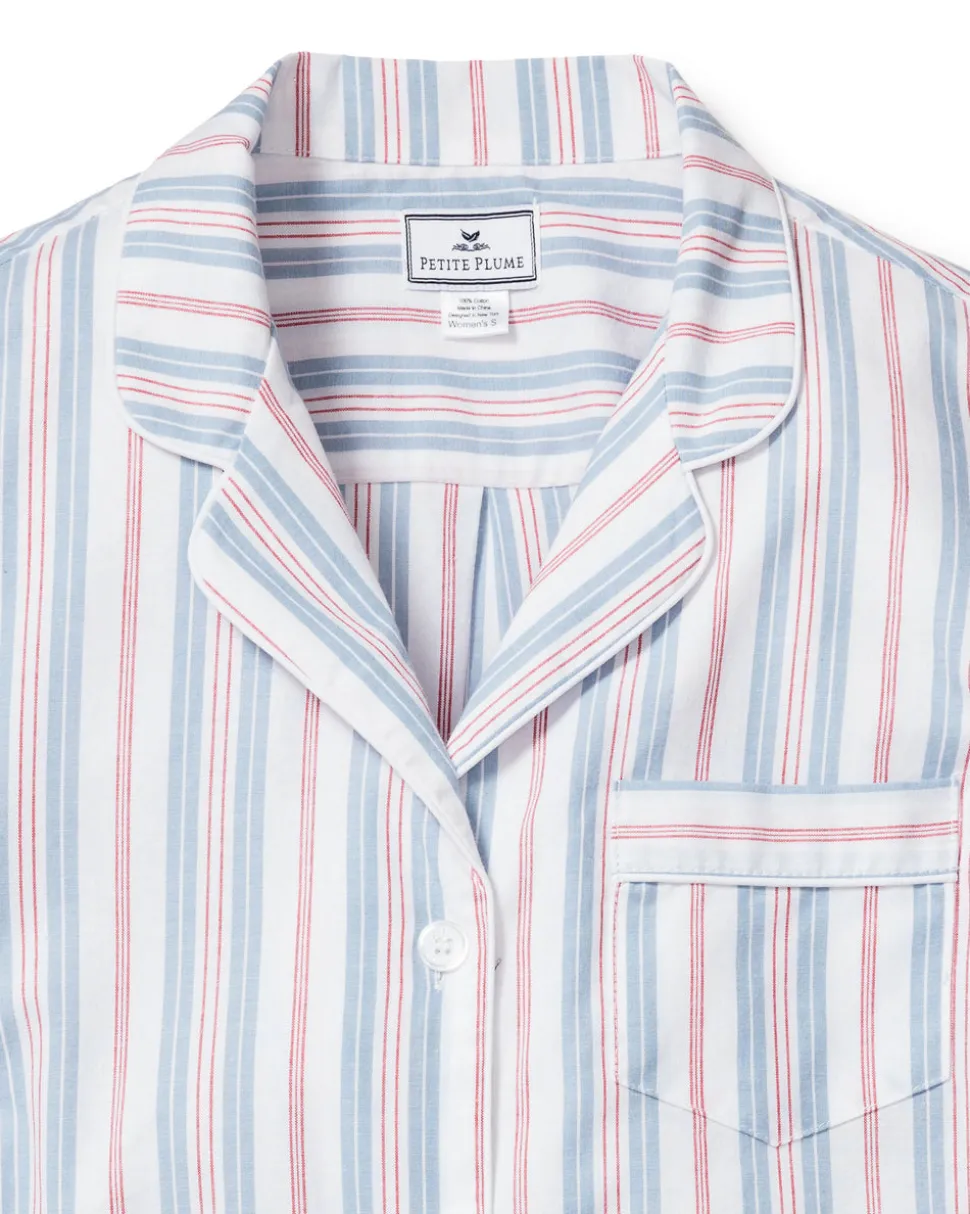 Petite Plume wishes you a “bonne nuit,” and in their luxury sleepwear, it’s hard not to oblige. Crafted from the finest quality 100% cotton, and brushed for added softness, the Women’s Twill Short Sleeve Short Set in Vintage French Stripes evokes a chic timelessness of eras past. Featuring blue and red stripes against a crisp white base, this pajama set embodies the simple charm of vintage style, updated with the most comfortable fit.