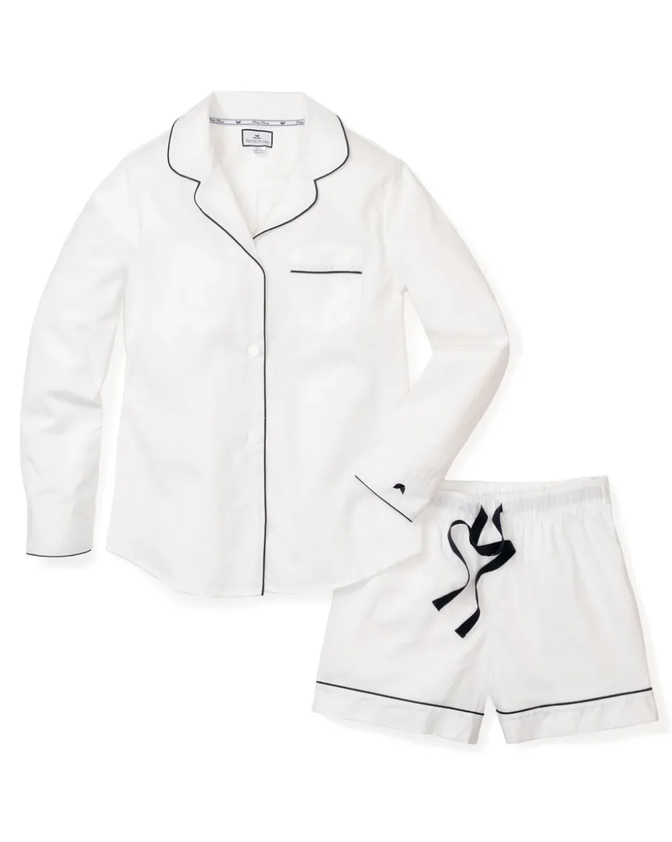 Petit Plume’s luxury sleepwear is a dream come true. Crafted in exquisite cotton, with the finest attention to detail, no chemicals, and classic silhouettes, Petite Plume delivers the utmost comfort and sophistication to every man, woman, and child who wears it. Made in a preshrunk, yarn-died fabric, and accented with contrast piping, the Women’s White Long Sleeve Short Set with Navy Piping is specially brushed so that every wash brings more coziness, and better sleeps. Lovely and dreamy.
