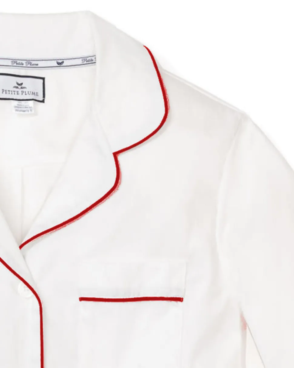 Petit Plume’s luxury sleepwear is a dream come true. Crafted in exquisite cotton, with the finest attention to detail, no chemicals, and classic silhouettes, Petite Plume delivers the utmost comfort and sophistication to every man, woman, and child who wears it. Made in a preshrunk, yarn-died fabric, and accented with contrast piping, the Women’s White Twill Pajama Set with Red Piping is especially soft, so that every wear brings more coziness and better sleeps. Simply dreamy.