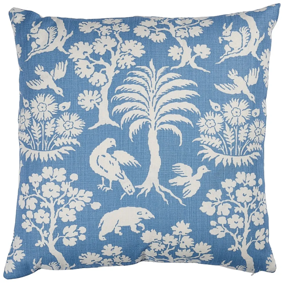 Founded by Frederic Schumacher in 1889 on Fifth Avenue in New York, Schumacher design transcend trends and time with generations-tested unwavering devotion to beauty and quality. Their luxury pillows, fabric, wallpaper, trim, and furniture allow decorators and shoppers alike to create with total confidence. A charming, of-the-moment print inspired by an early 20th-century document, the Woodland Silhouette 20″ Pillow in Blue is printed on a slubbed linen that gives it a lovely antique quality.