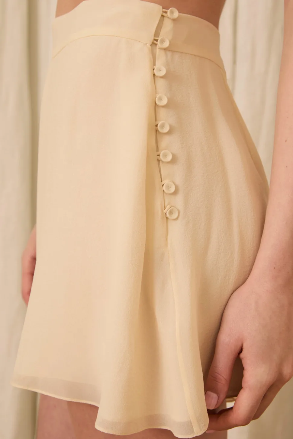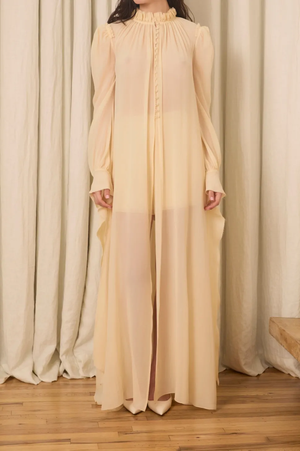 Silk chiffon. Lined in silk georgette. Silk-covered button side seam closure.