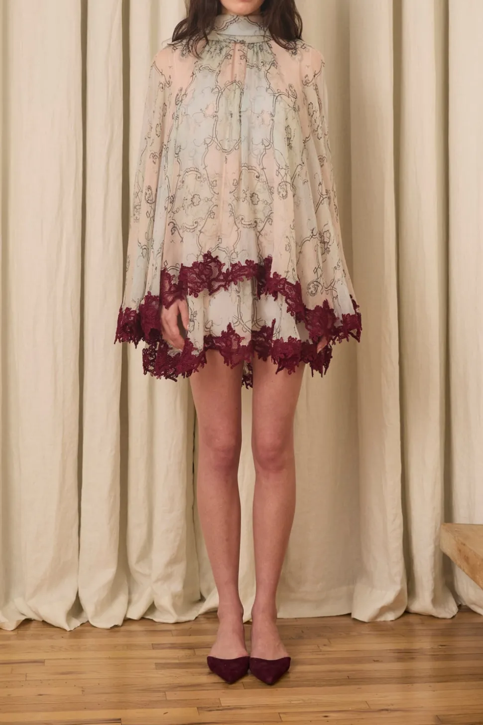 After honing her design vision and couture experience at Zac Posen, Narciso Rodriguez, and Chanel, Meredith Stoecklein emerges on her own with LEIN. The brand offers a new concept of tasteful, stylish wedding wear for the thoroughly modern bride. The Wylie Scarf Dress in Printed Crinkled Chiffon with Mohair Lace Trim is a tiered trapeze cape overlay dress in Italian printed silk chiffon with Italian wool lace trim.
