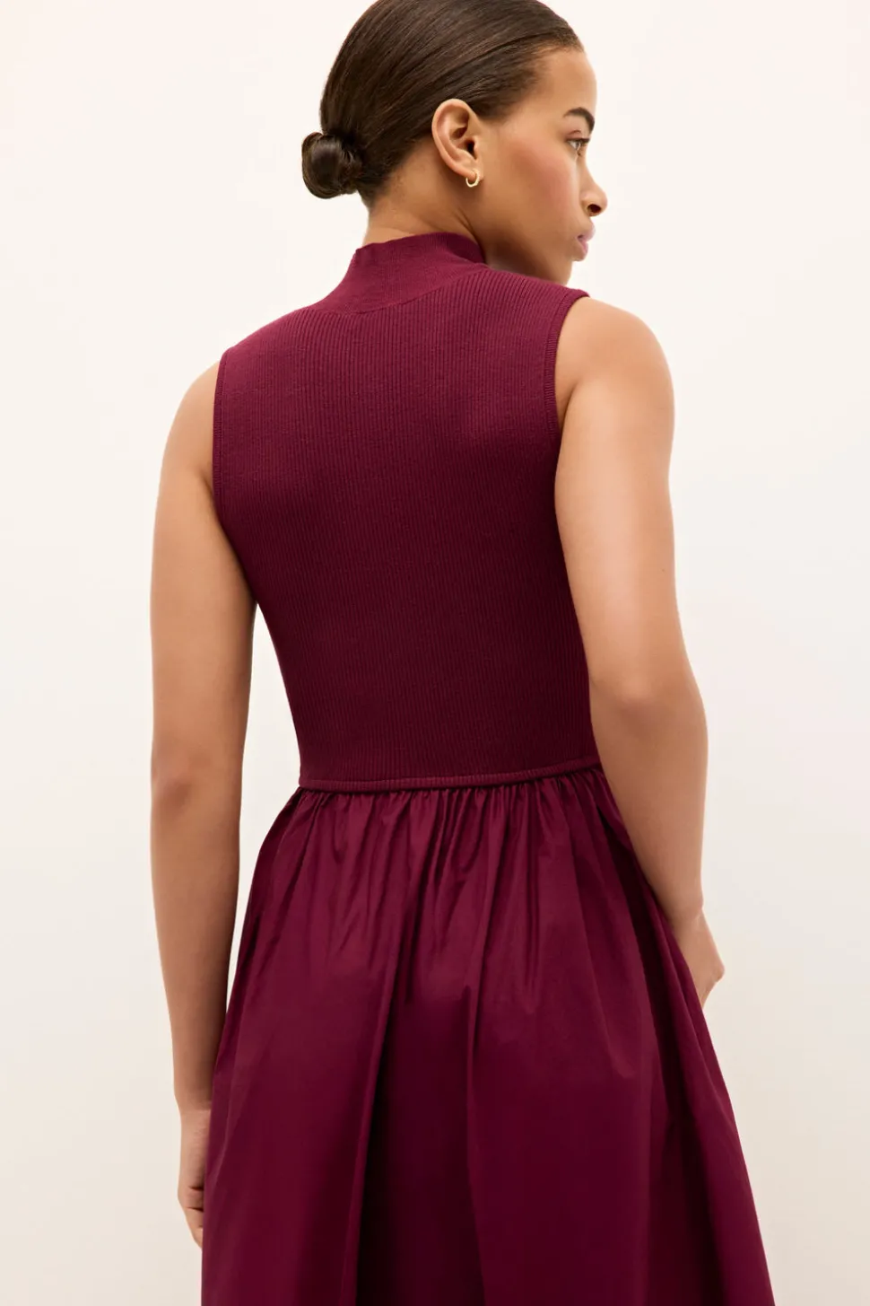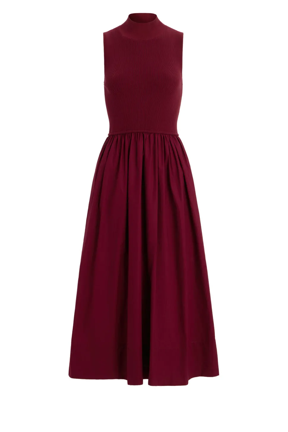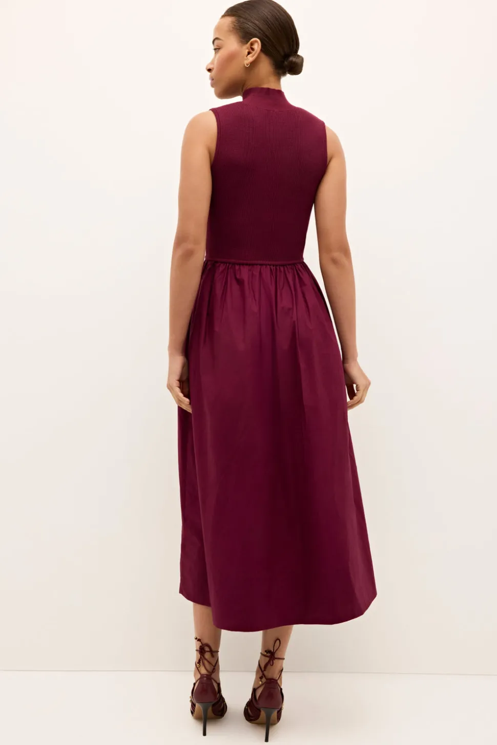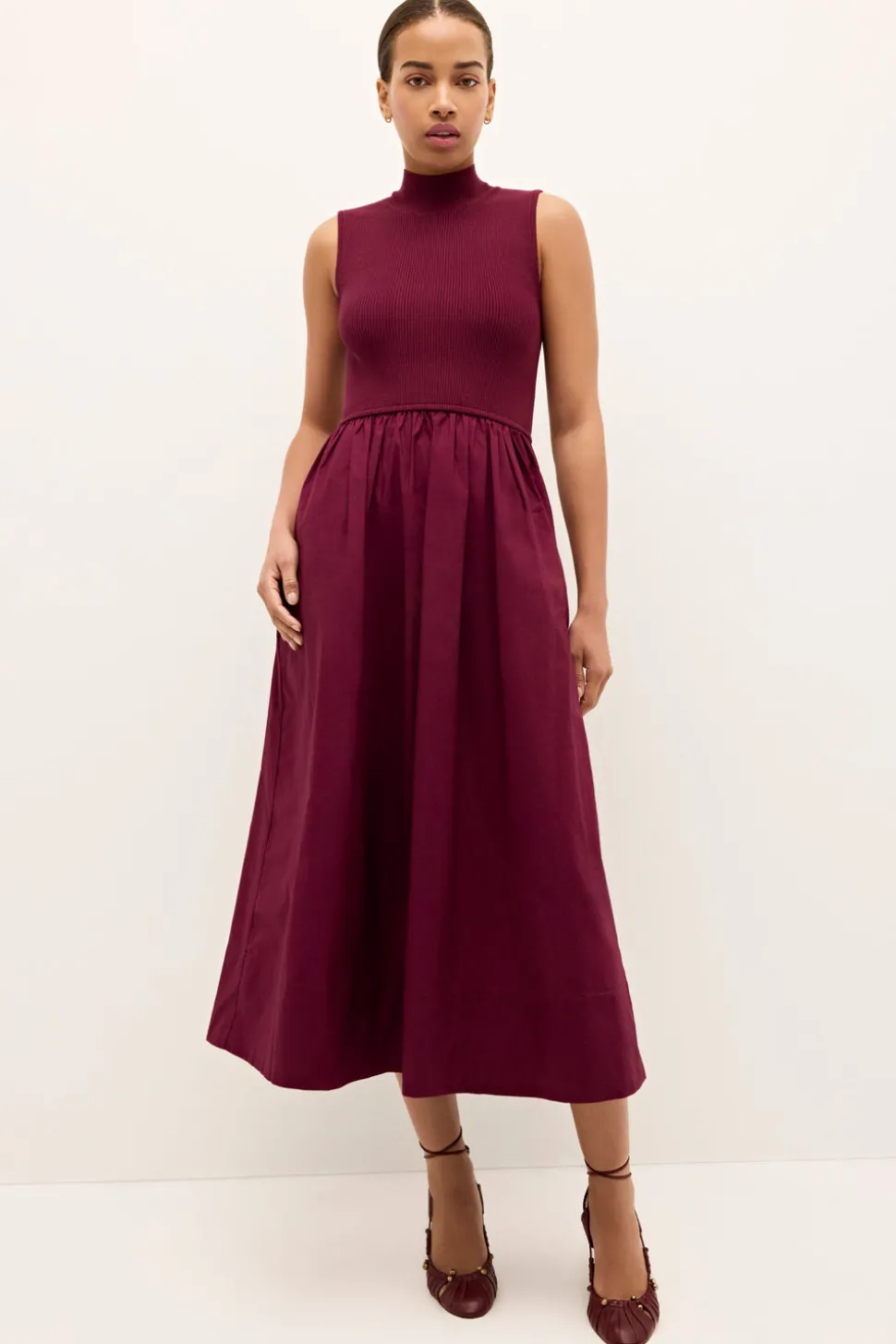 Empowering women through vivid hues and the joy of style, Sarah Doggett Evenson uses her archive of artistic prints, fine fabrics, and flattering silhouettes to make each Marie Oliver piece instantly uplifting. The Yana Dress in Potion reimagines sleek mock-turtleneck lines and a figure-flattering bodice as an effortless maxi. With its ribbed knit top, full gathered cotton poplin skirt, and practical side pockets, the silhouette blends style and comfort in equal measure. The rich red-purple hue ensures this standout design transitions seamlessly across seasons.