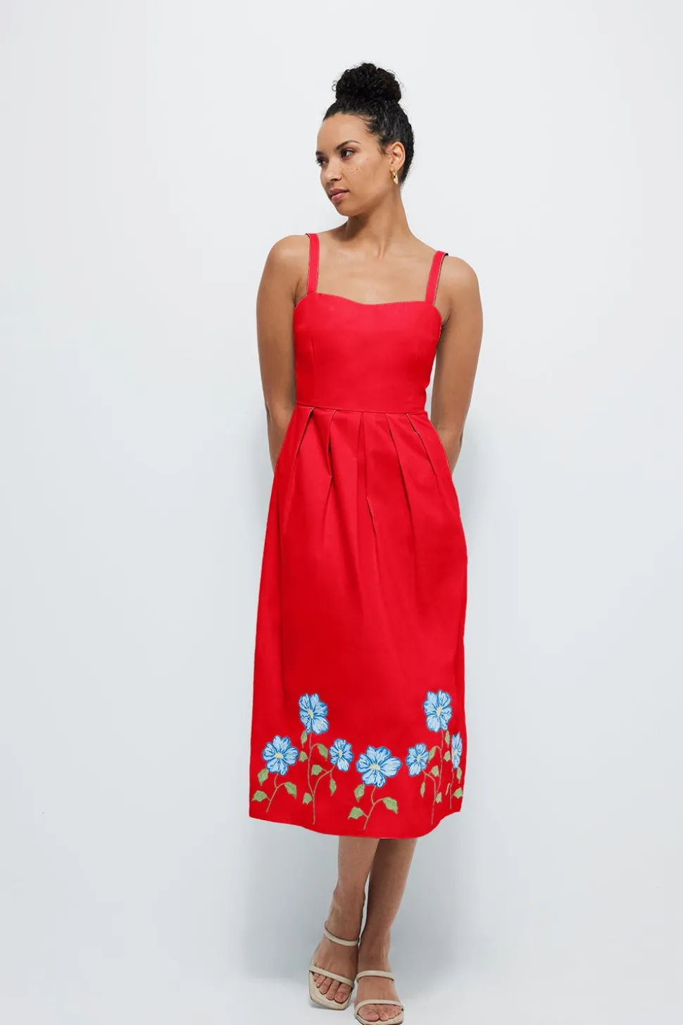 100% cotton. Slight sweetheart neckline. Sleeveless. Adjustable shoulder straps. Pleated front skirt at the waist. Blue magnolia embroidery along the bottom hem. Back zipper closure. Dress length: 39.4″.