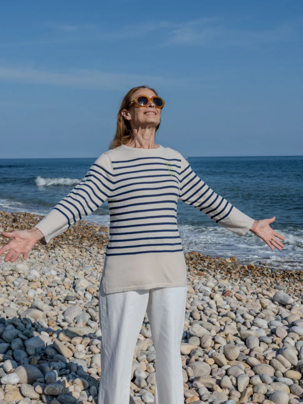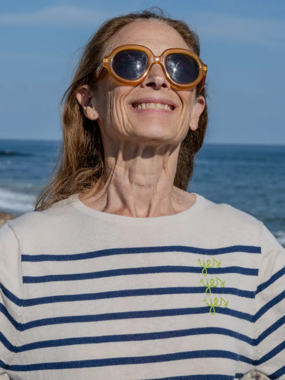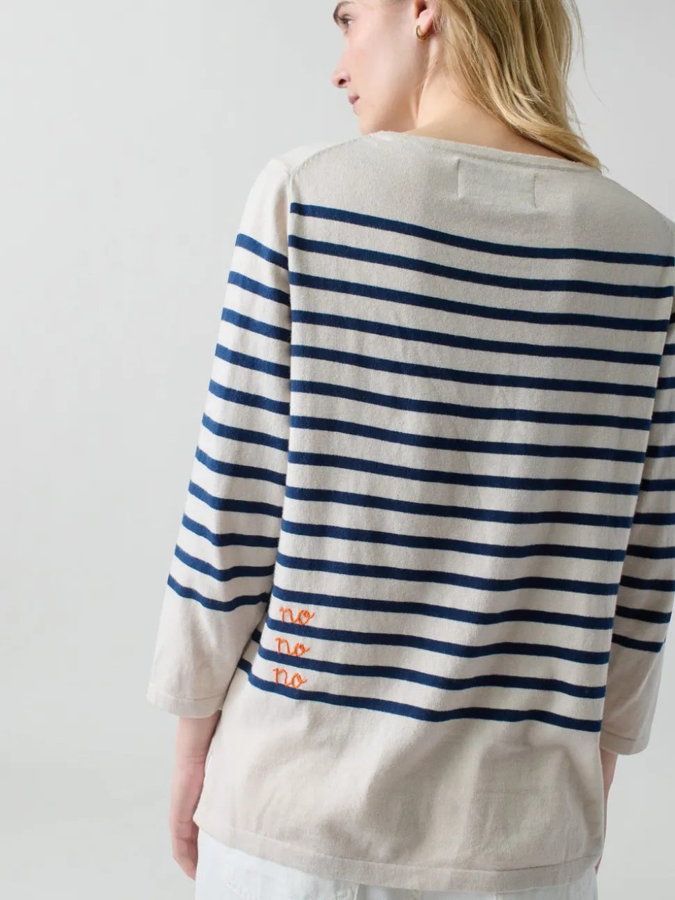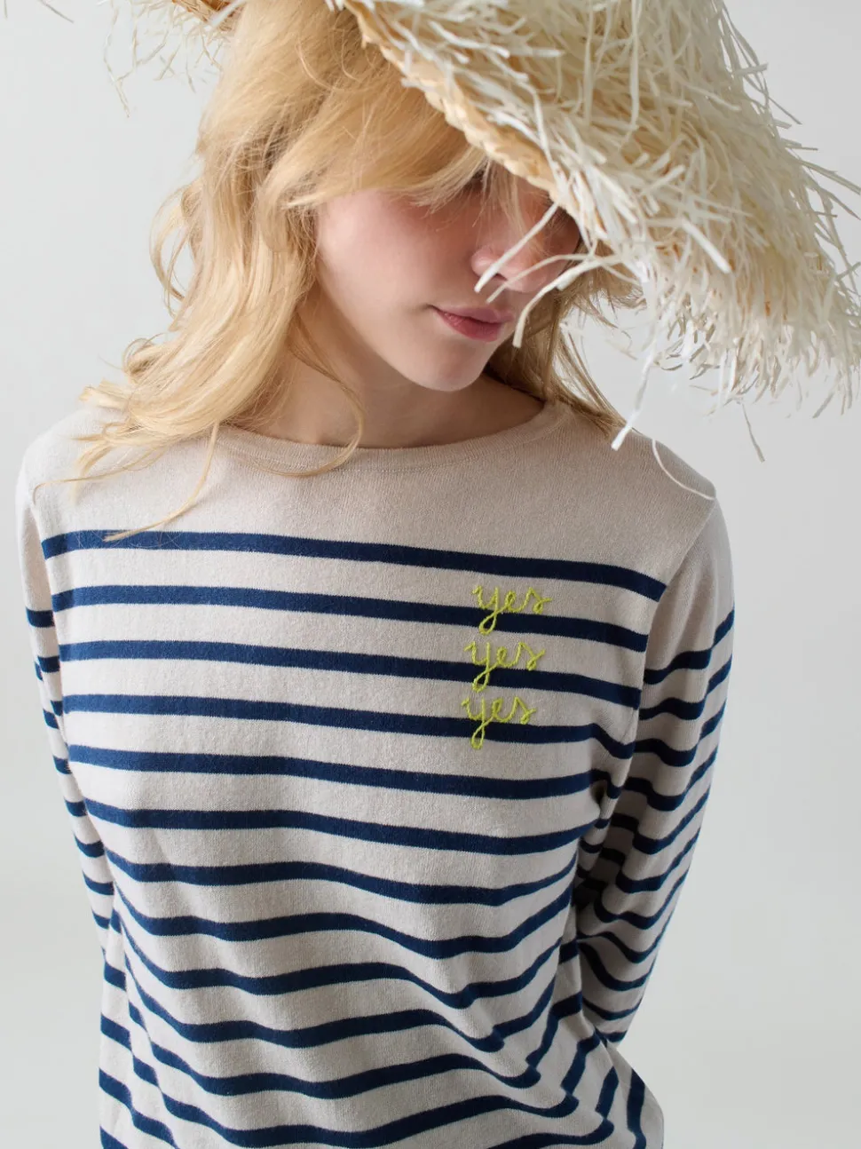 Lingua Franca is a line of sustainably-sourced, fair trade luxury ready-to-wear and cashmere pieces, all hand-stitched by women in New York City. Every word on Lingua Franca’s staple pullover sweaters is chalked in script by designer Rachelle Hruska MacPherson before it is ever stitched. You’ll want to live in the Yes/No Boatneck In Canvas. Extremely lightweight and fine gauge, it’s crafted from a luxurious silk and cotton blend for ultimate comfort. Inspired by traditional sailing sweaters, it’s a go-to for both casual wear and seaside adventures. Embroidered with Robert Lax poem on the front reads “yes yes yes” on the front and “no no no” on the back.