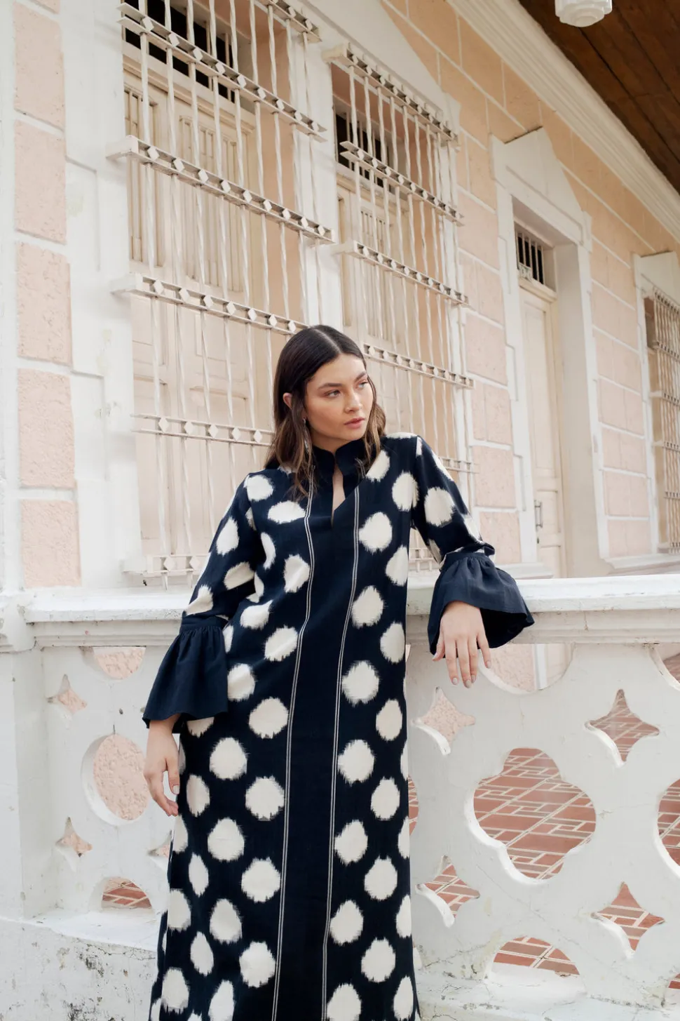 De Castro showcases a seamless and unique blend of traditional Indian craftsmanship, contemporary design, and the founder’s Colombian heritage. Every piece is handmade by artisans, using time-honored techniques and the finest cotton and silk fibers, resulting in exceptional quality, sustainability, and style. Hand-loomed in gorgeous, organic cotton, the Yin Yang Dress boasts a tunic silhouette, with a chic side slit offering movement, and flounce sleeves for a romantic touch.
