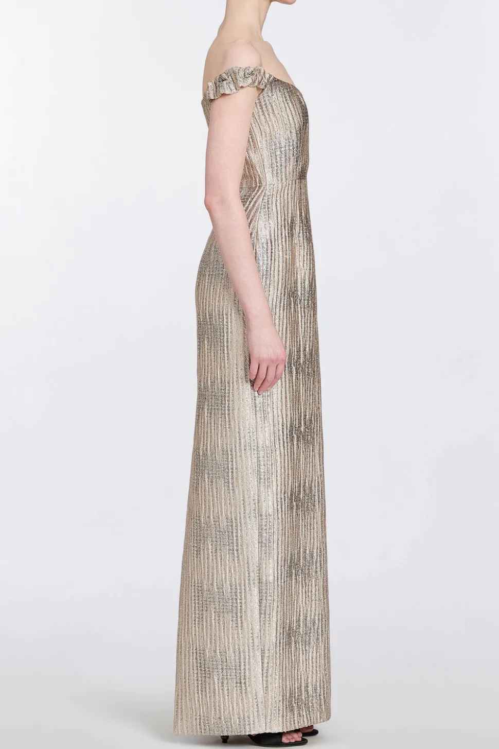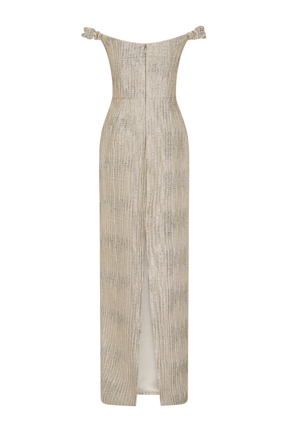 Named after a radiant group of galaxies, Markarian combines designer Alexandra O’Neill’s love of the cosmos and celestial romanticism with timeless design and modern silhouettes. A forward-thinking approach to fashion and a focus on fine craftsmanship mean Markarian is beautiful and impeccably well-made. The Yolanda Wavy Gold Brocade Gown is a striking statement piece, cut in luminous gold brocade with a fluid silhouette that captures light and movement with ease.