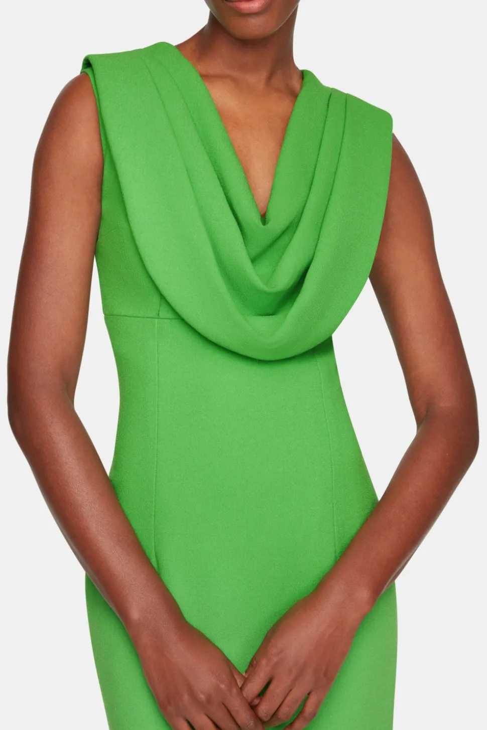 Emilia Wickstead is the epitome of modern femininity. Established in the U.K. in 2008, the ready-to-wear designer is known for impeccable tailoring, bold color, and timeless quality. With sculptural elegance and a modern edge, the Yuri Dress in Fresh Green Single Wool Crepe contrasts architectural drapery at the neckline with a precisely tailored silhouette. Cut in textured crepe and finished with a back vent for movement, it offers a striking take on contemporary occasionwear.