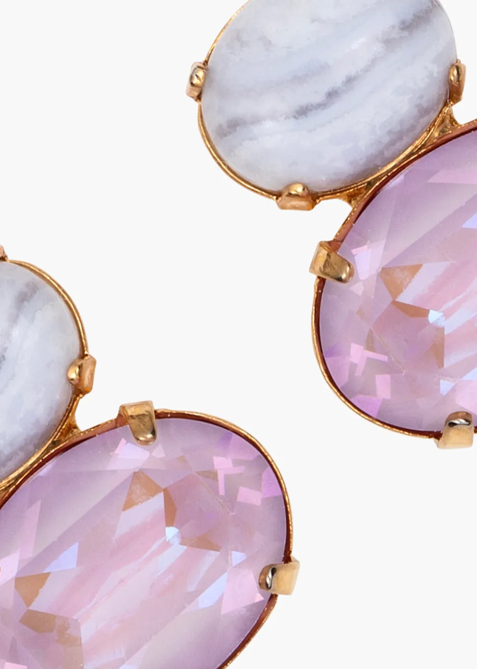 “Everything has a story to tell,” says Jennifer Behr, the founder of her namesake luxury hair accessory brand that has blossomed into one of New York City’s foremost ateliers for jewelry, as well as bridal. In every crystal, pearl, and ribbon, you’ll find the utmost quality and a sense of romance, as each piece reveals a modern interpretation of centuries-old regalia. The Yvette Earrings combine gorgeously faceted crystals with semi-precious gemstones to create a harmonious tonal palette. They feature either semi-precious blue lace agate, a highly prized stone naturally formed in seabeds, known for its association with the throat chakra, promoting calm, clear communication or semi-precious chalcedony, which is known as a grounding stone for its ability to promote calmness and inner peace. . These delicate earrings pair seamlessly with anything.