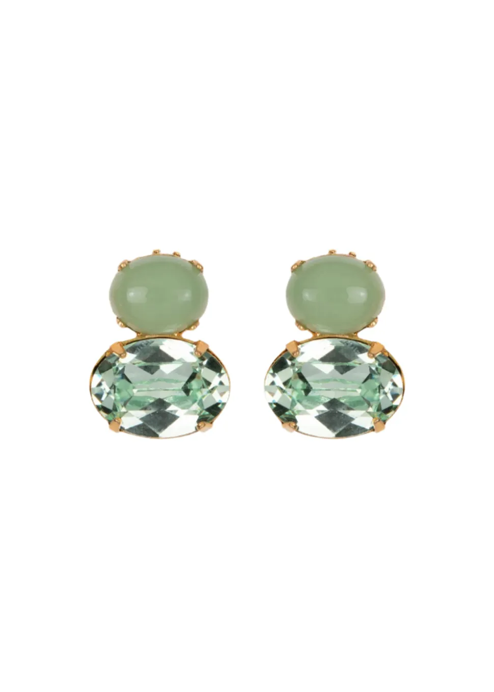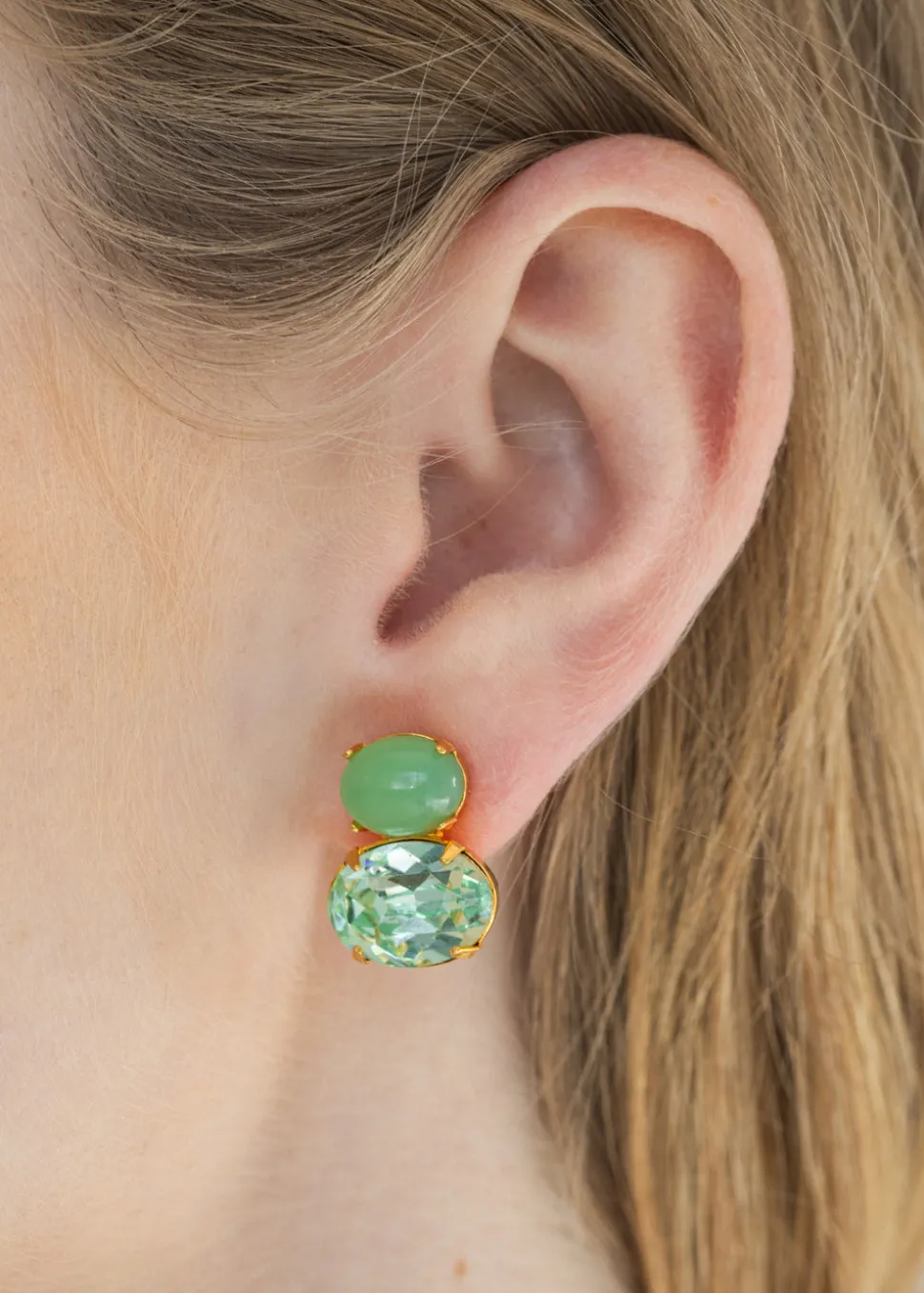 “Everything has a story to tell,” says Jennifer Behr, the founder of her namesake luxury hair accessory brand that has blossomed into one of New York City’s foremost ateliers for jewelry, as well as bridal. In every crystal, pearl, and ribbon, you’ll find the utmost quality and a sense of romance, as each piece reveals a modern interpretation of centuries-old regalia. The Yvette Earrings combine gorgeously faceted crystals with semi-precious gemstones to create a harmonious tonal palette. They feature either semi-precious blue lace agate, a highly prized stone naturally formed in seabeds, known for its association with the throat chakra, promoting calm, clear communication or semi-precious chalcedony, which is known as a grounding stone for its ability to promote calmness and inner peace.