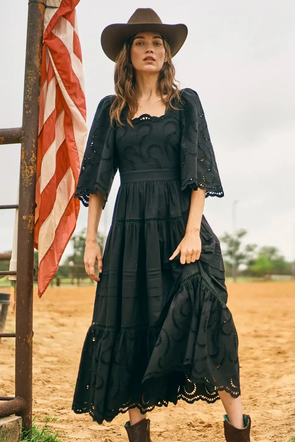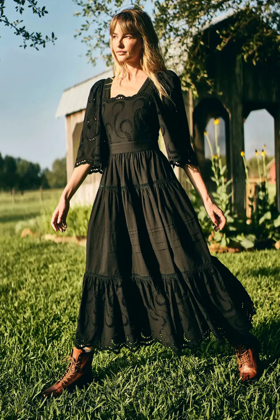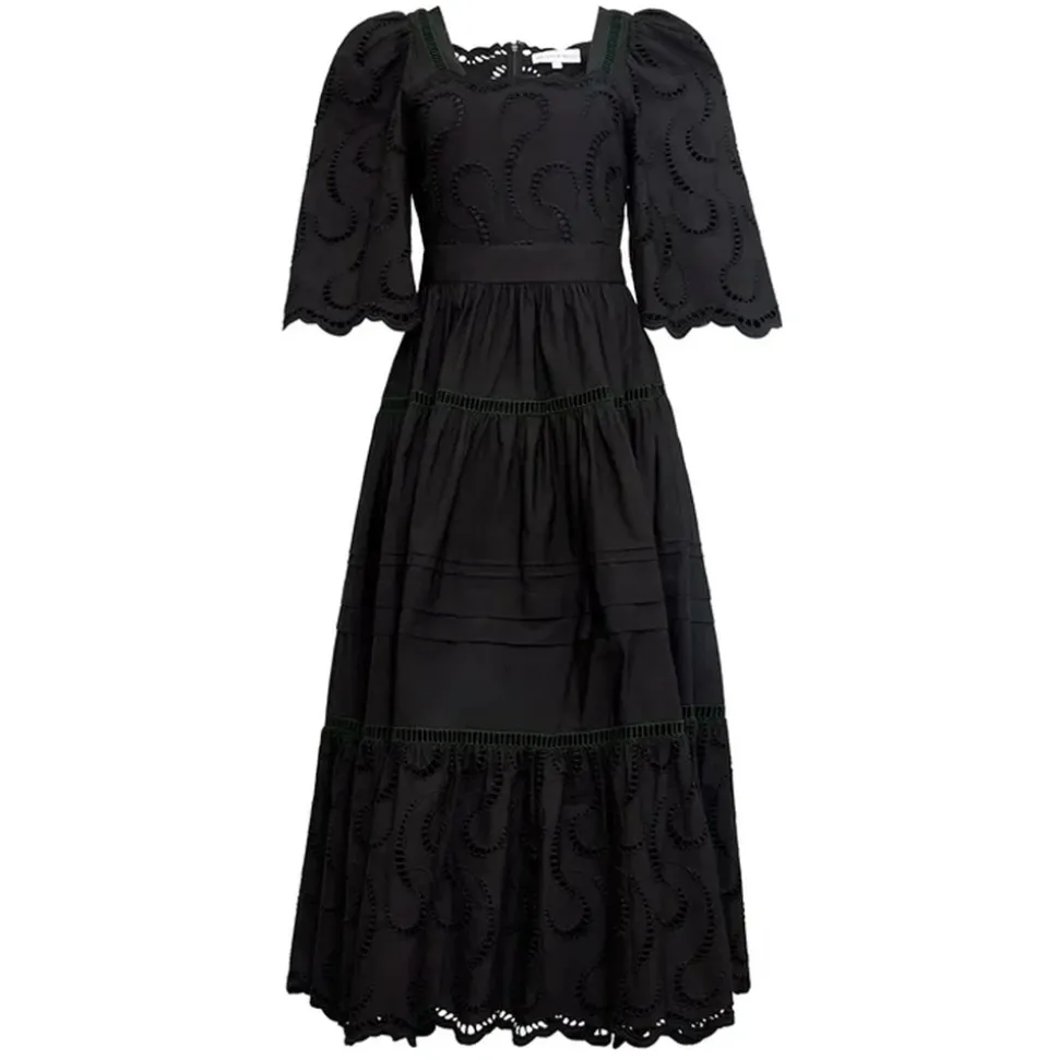 Hunter Bell strives to spark joy and inspiration with clothing that empowers women to embrace their personal style. The New York City–based brand is all about fashion-forward, fun looks, designed with detailed craftsmanship and exceptional wearability. The Zadie Dress in Black is a striking new silhouette that blends timeless romance with modern ease. Featuring a flattering square neckline, flowy elbow-length sleeves, and a fitted bodice that defines the waist, it falls into a full tiered skirt for effortless movement. Crafted in embroidered eyelet poly cotton, the intricate detailing adds depth and texture to this standout piece. Finished with a back zipper closure, Zadie is an effortlessly elegant midi you’ll reach for season after season.