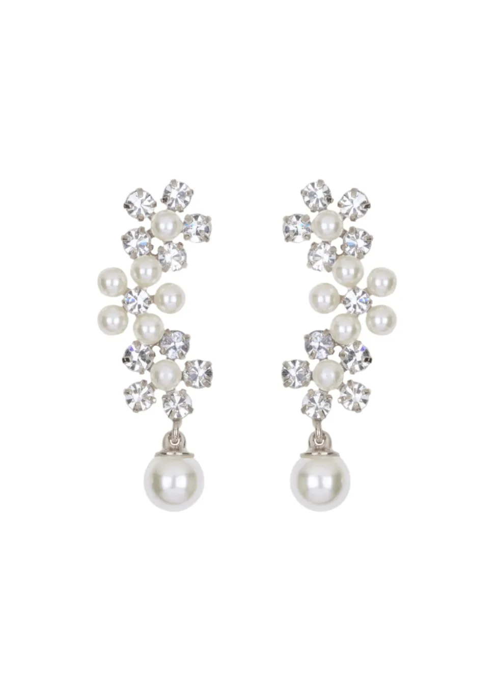 The Zaya Earrings in Crystal are made by hand in New York, from 18K gold or rhodium plated brass, crystals, and crystal pearls. They have a surgical-steel post, are nickel-free, and safe for sensitive skin.