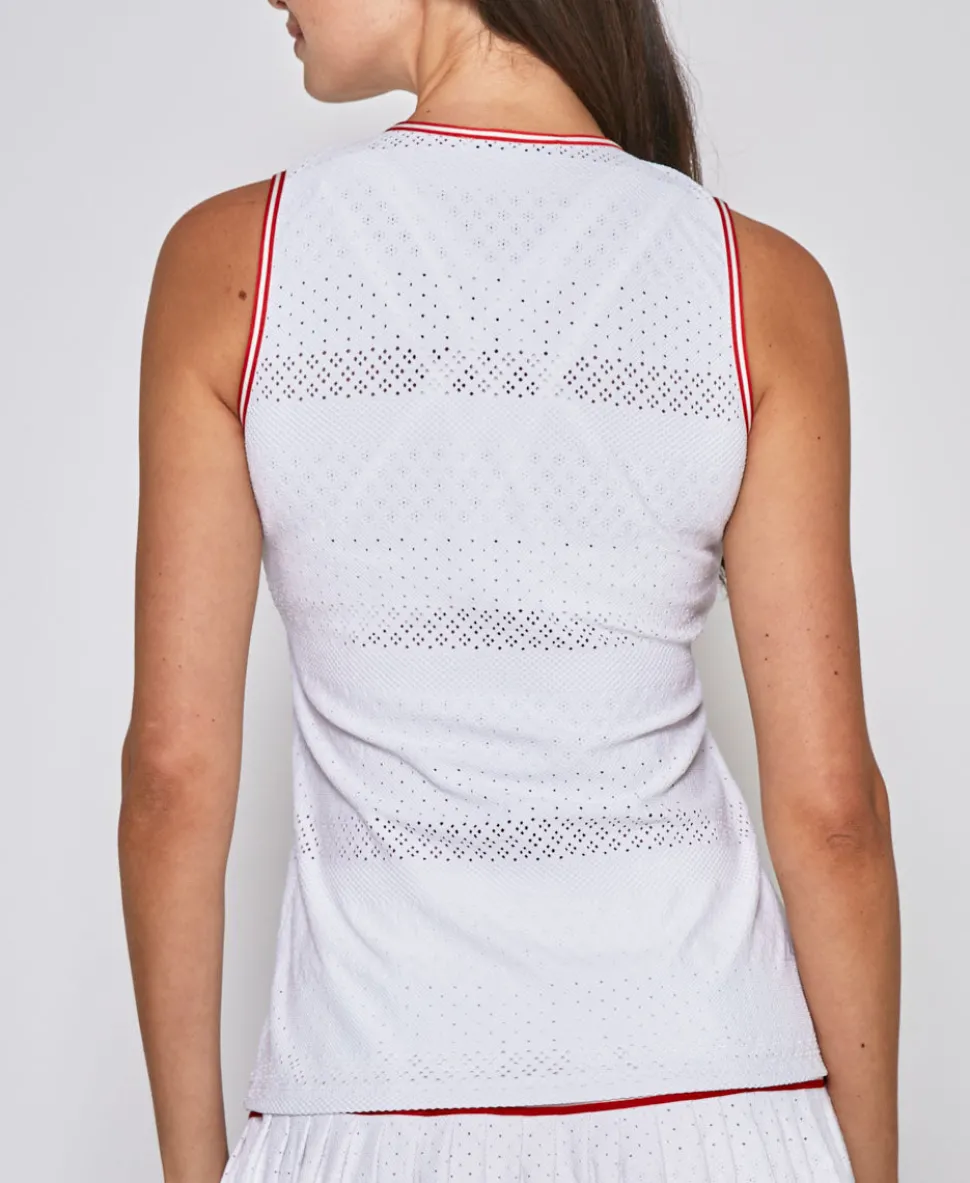 A former professional athlete, Yesim Philip founded L’Etoile Sport to give women luxury, high-performance activewear made with flattering cuts and the most innovative materials. Embracing freedom of movement and timeless silhouettes, these are pieces that add to your game, and your style. Crafted in a four-way stretch fabric, with a high neck, the Zip Front Tank in White is breathable, light, and eye-catching, especially with its navy trim.