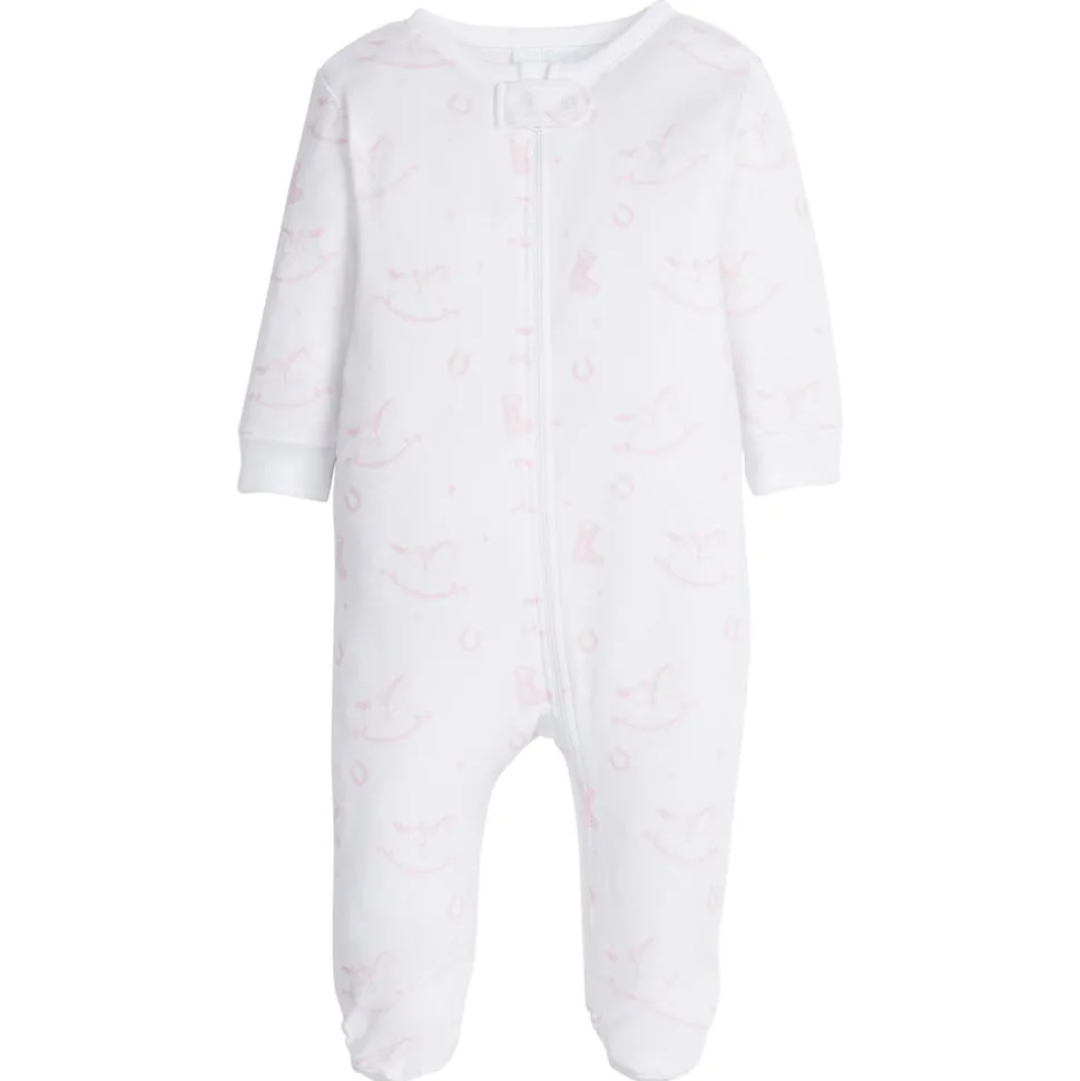 Shannon Latham founded Little English in 2004 with the belief that children should always be well-dressed. Employing hand-smocking, hand-embroidery, and the very best fabrics, Shannon and her daughter design timeless pieces that will be worn for generations to come. The Zippered Footie in Pink Rocking Horse is crafted in soft pima cotton and patterned with a light pink western print of rocking horses, horseshoes, and cowgirl boots. Designed for comfort and convenience, it features a zipper closure down the front and a snap at the neck for easy dressing. Brother can coordinate in the matching Zippered Footie in Blue Rocking Horse for a sweet sibling set.