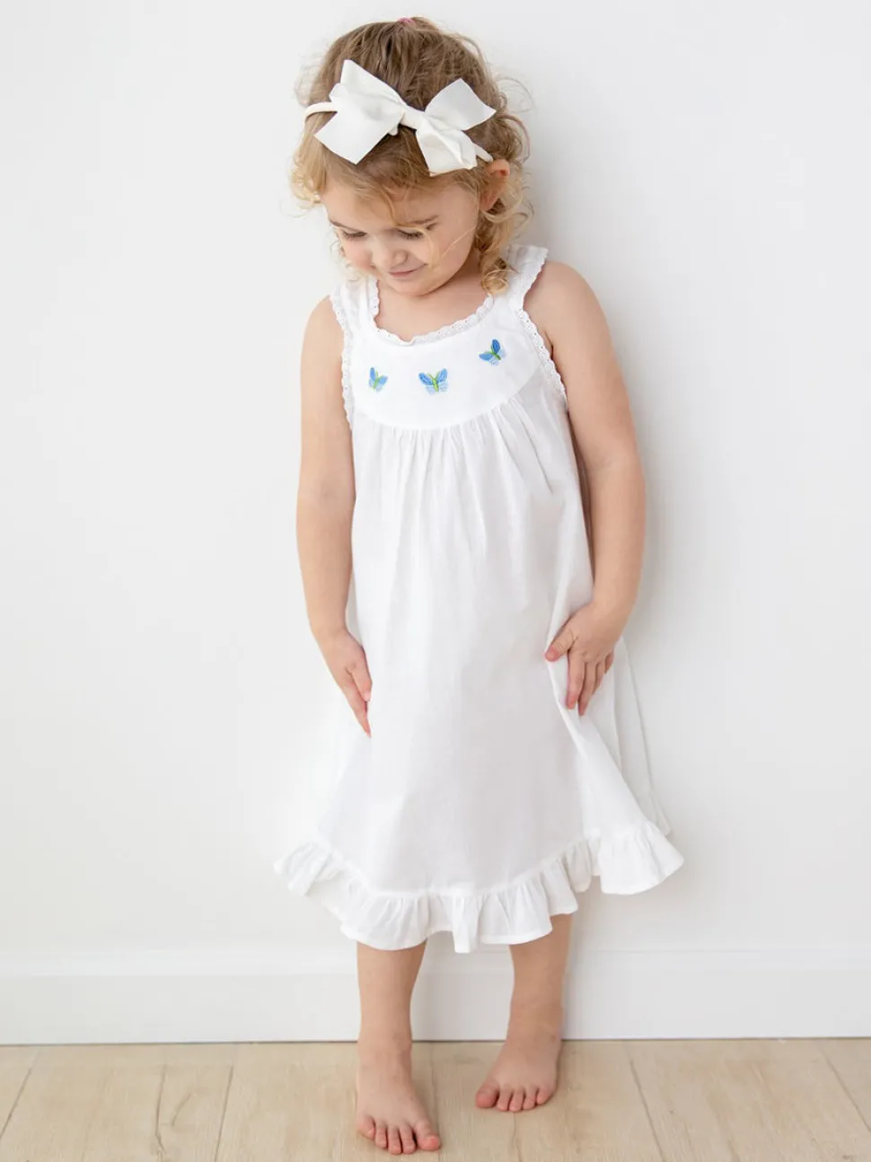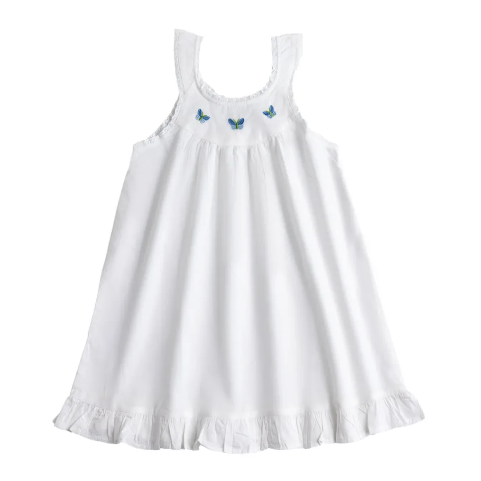 Embracing a European aesthetic of hand embroidery with elegant touches of cotton lace, Jacaranda Living produces a wide variety of high quality luxury linens—for bath, table, sleepwear, and more that feel as good as they look in your home or wardrobe. Mom and daughter-approved, the Zoe White Cotton Dress with Blue Butterfly Embroidery arrives with a cute ruffle hemline that makes playing in this dress easy breezy fun. This dress can be monogrammed below the butterfly.