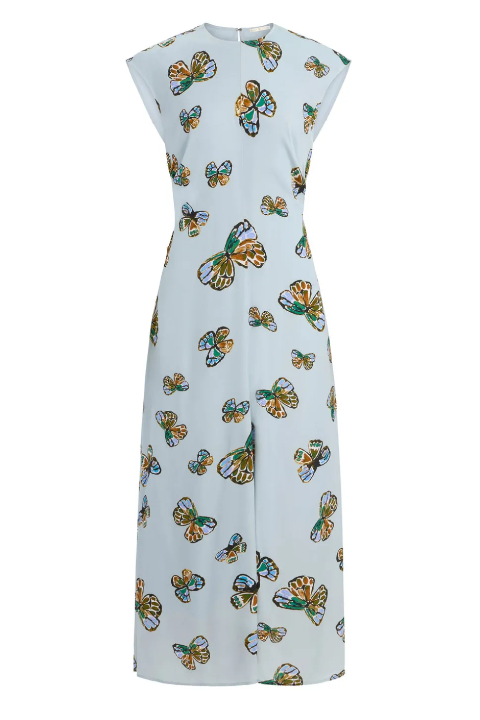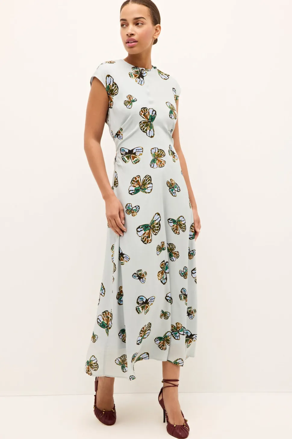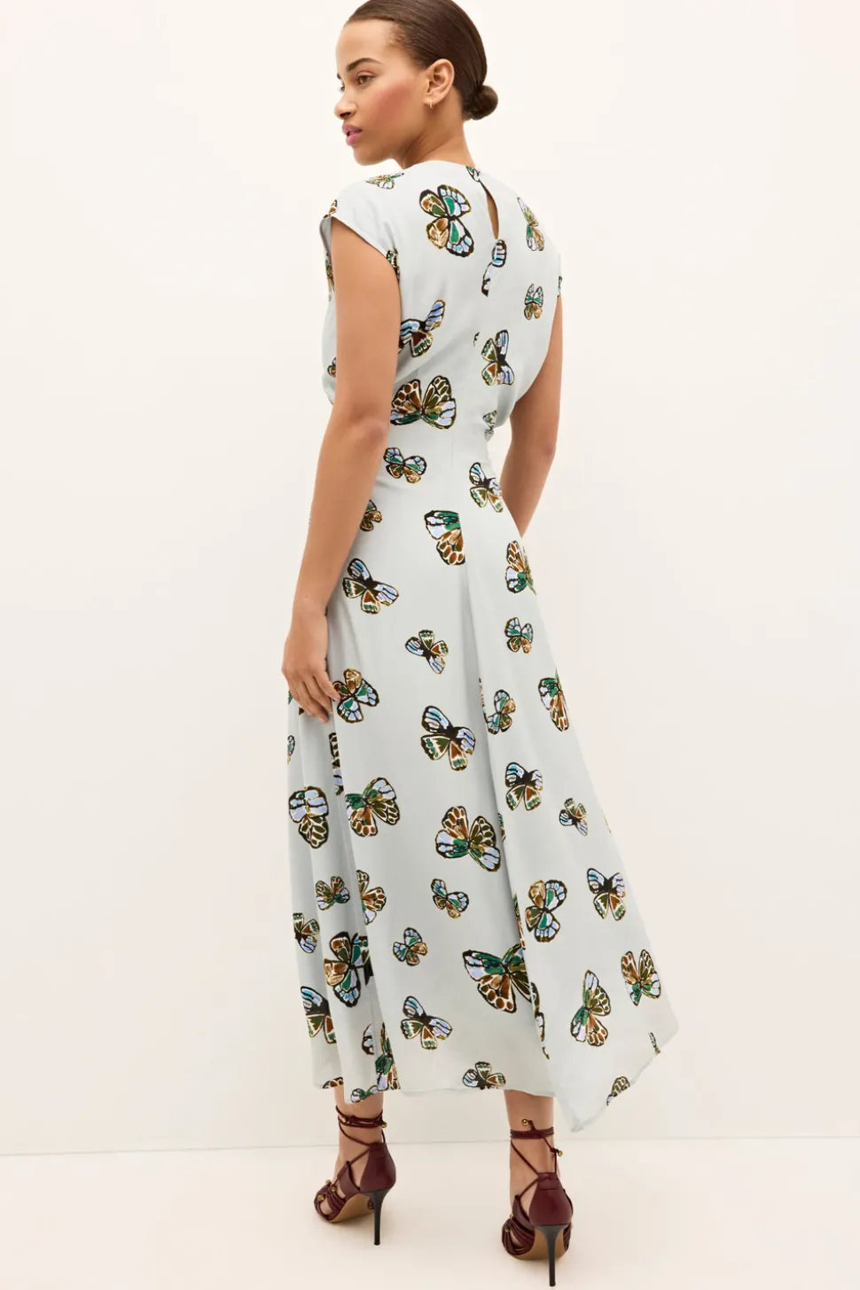 Empowering women through vivid hues and the joy of style, Sarah Doggett Evenson uses her archive of artistic prints, fine fabrics, and flattering silhouettes to make each Marie Oliver piece instantly uplifting. The Zuri Dress in Adonis is cut on the bias for graceful drape, with pleated waist detailing that flatters the silhouette and a center-back keyhole for subtle allure. Shown in the lighthearted Adonis print, a kaleidoscope of butterflies dances across a sky-blue ground, bringing a playful dimension to this sophisticated maxi.