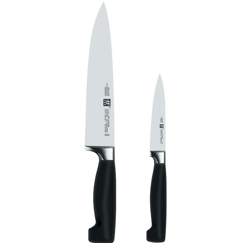Way back in 1731 Peter Henckels thought to register the Zwilling trademark with the Cutler’s Guild of Solingen, Germany, which makes it one of the oldest brands in the world today. The company started with the production of a kitchen knife and now is a specialist for international culinary culture as we know it today. The Zwilling J.A. Henckels Four Star 2-Pc “The Must Haves” Knife Set is the model of safety, ergonomics, and comfort. Thanks to their seamless transition from bolster to handle, the knives are comfortable to use for long periods of time, and the bolster provides the right balance while acting as a safe finger guard. The sleek knives are made of proprietary special formula steel that has been perfected for over 280 years.